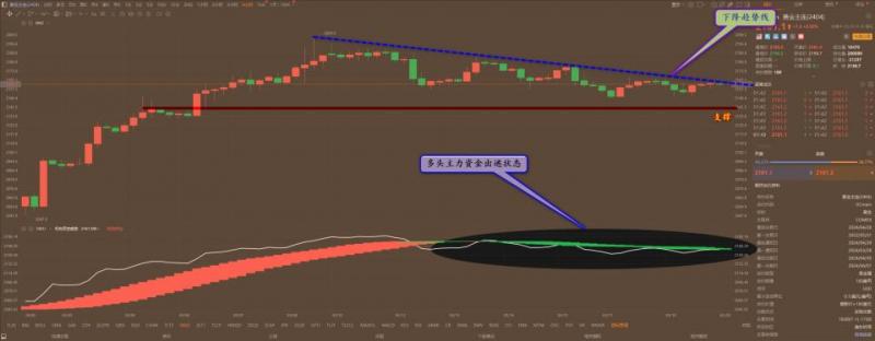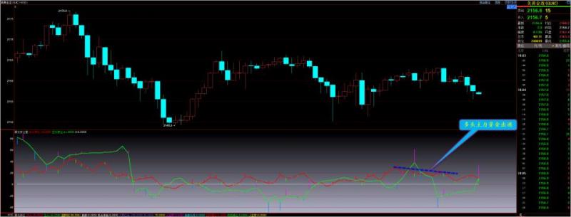通过对黄金4小时图解析得知,黄金早盘在上方下降趋势线的压力位冲高回落,我们从下方的附图可以清楚地看到多头主力资金已经连续几个交易日处于出逃的状态,虽然中间有小幅反弹但是反弹的力度不够短期已经形成顶底下移的动作,短期进一步震荡下行的可能性比较大一点,,但是也不排除受数据影响向上突破到达上方2172和2186