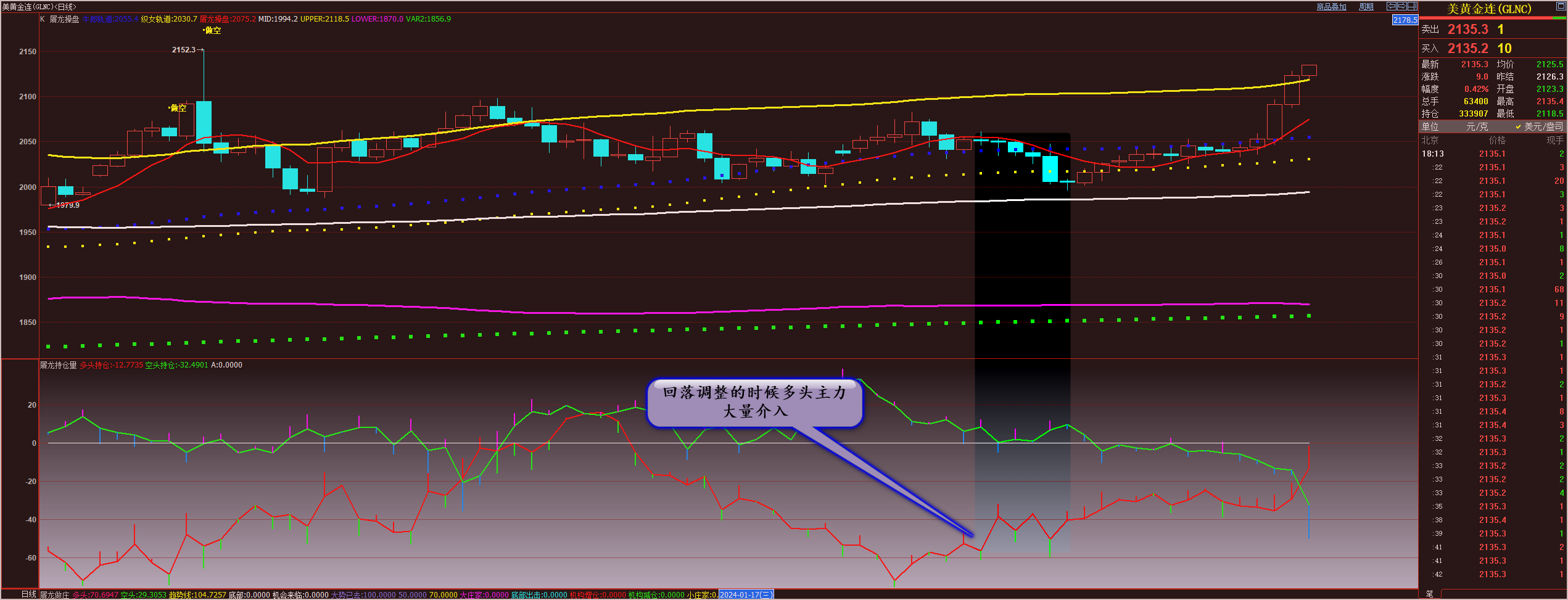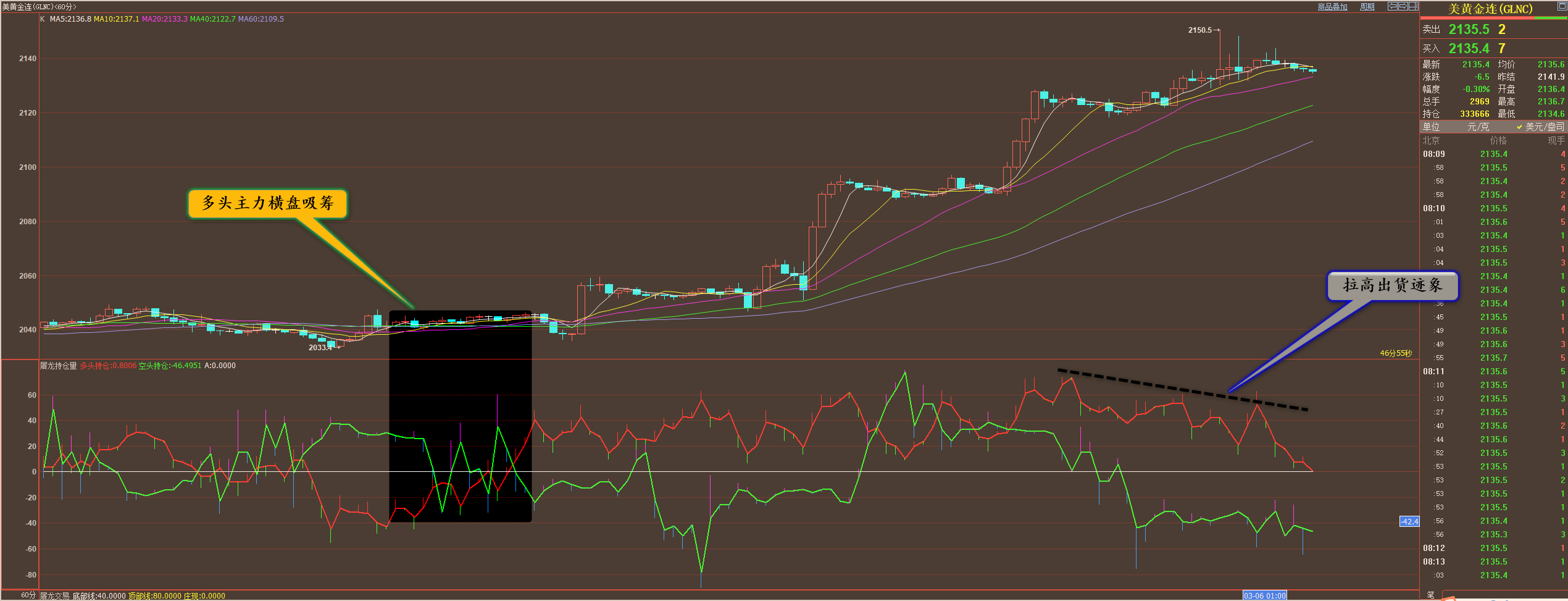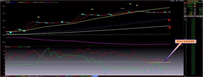 通过对黄金小时图解析得知,昨日行情先跌后涨,在下方2123一线止跌反弹继续延续上涨走势,正如小妹前期所说一旦放量突破展示2065将会加速拉升,目前已经一发不可收拾即将到达2165和2197一线的目标位,我们从下方的附图可以清楚的看到在前两个交易日多头主力在拉高的时候有一部分多头主力出现了获利了结动作,晚间已经不