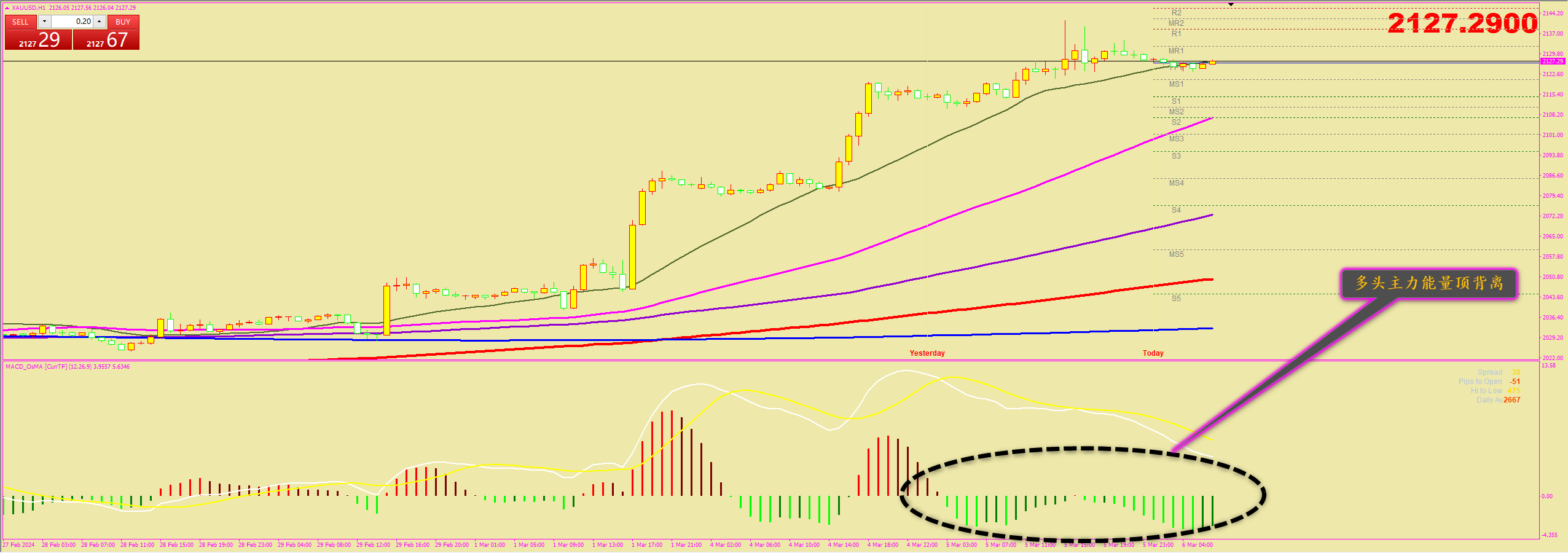 通过对黄金小时图解析得知,黄金从早盘到目前为止窄幅震荡调整运行,我们从下方的附图ACD可以清楚地看到行情在高位不断的向上突破创新高而下方的附图红色多头主力的能量柱呈现缩短迹象,说明多头主力动力不足短期已经形成资金的顶背离,但是短期整体趋势依然是多头排列,短期下方我们重点关注下方的均线系统的支撑对后期