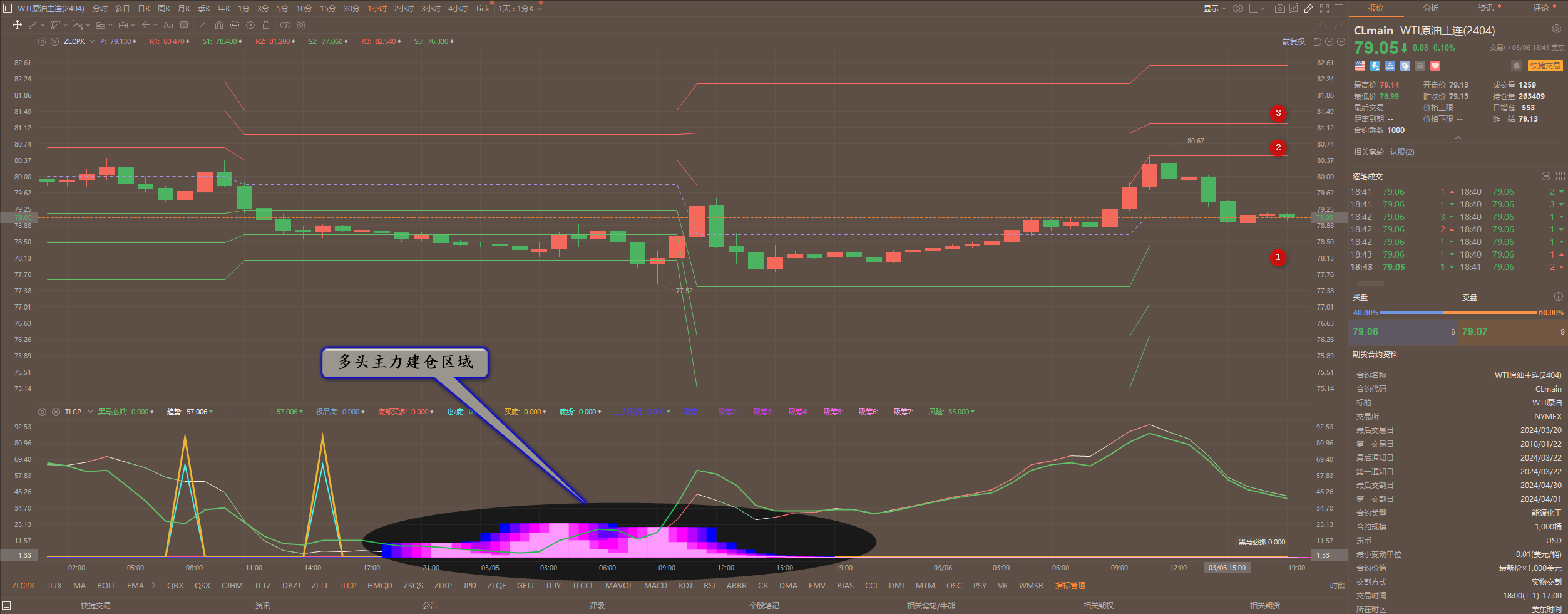 通过对原油小时图解析得知,昨日行情如期在下方止跌反弹启动上涨行情晚间一度到达上方80.70一线冲高回落,我们从下方的附图可以清楚的看到前两日在77.60一线出现了大量的多头主力布局建仓动作,晚间进行了启动上涨之前的震仓行为说明多头主力已经迫不及待的要启动上涨行情和我们的预期一样,目前短期虽然冲高回落但是已
