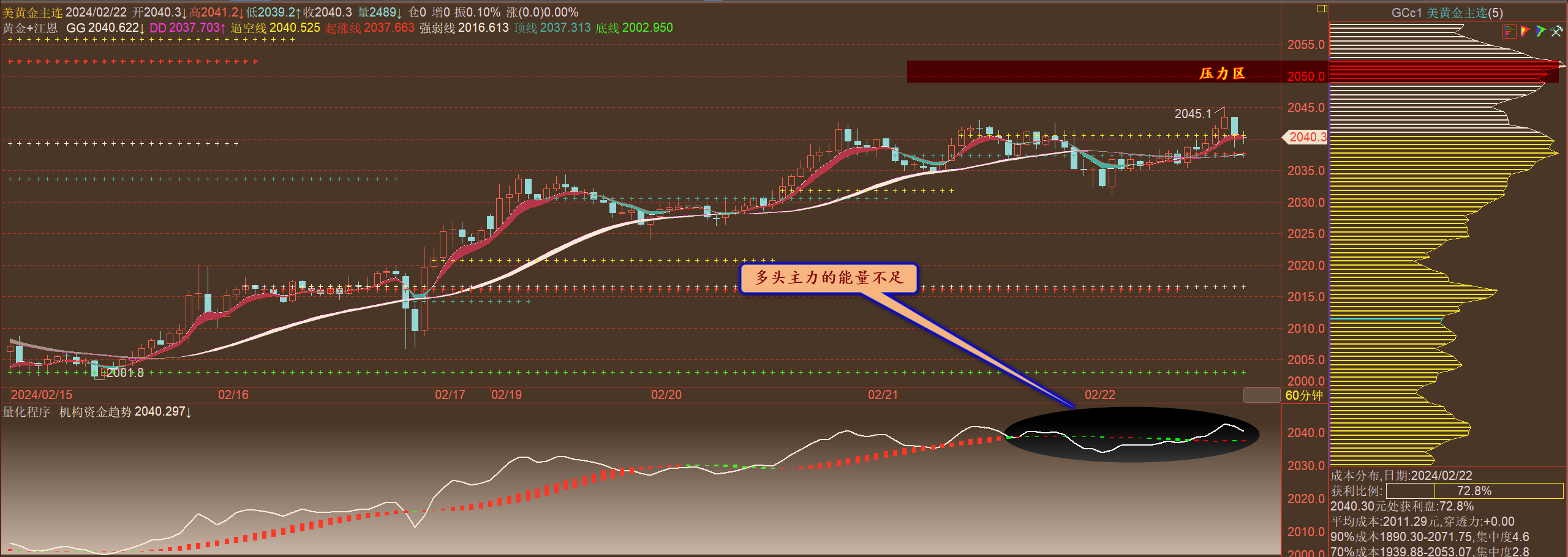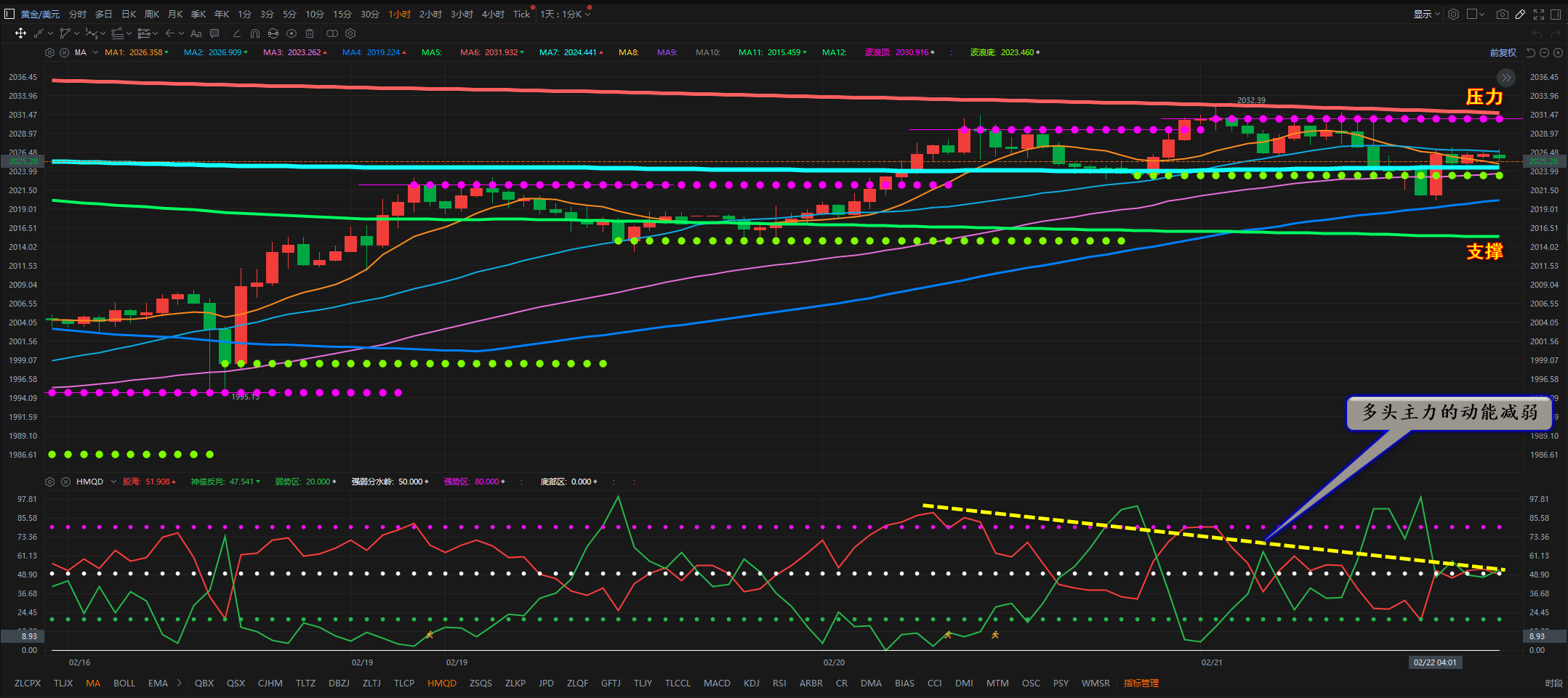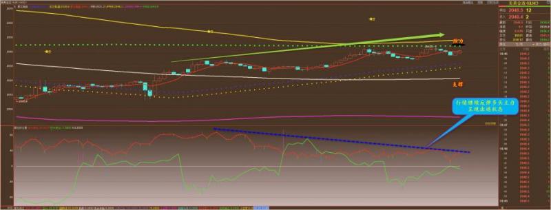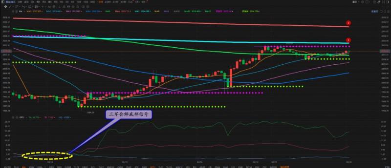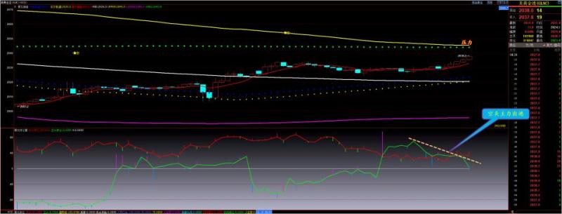 通过对黄金小时图解析得知,昨日行情如期在上方的均线压力位冲高回落,我们从下方的附图可以清楚看到多头主力的动能明显不足已经开始向弱势区转移迹象,在前两个交易日就已经提前告知家人们多头主力有出逃迹象短期反弹即将宣告结束,短期下方我们重点关注第一个支撑2016一线以及2007一线的支撑即可,短期上方2032一线依
