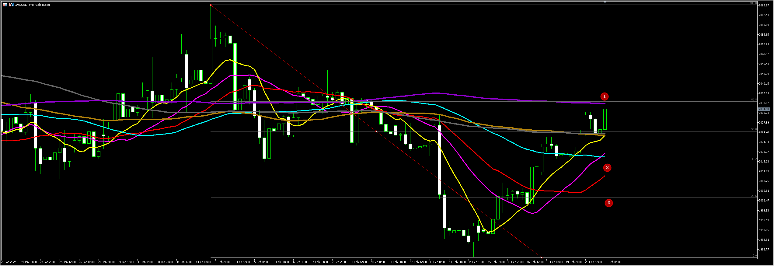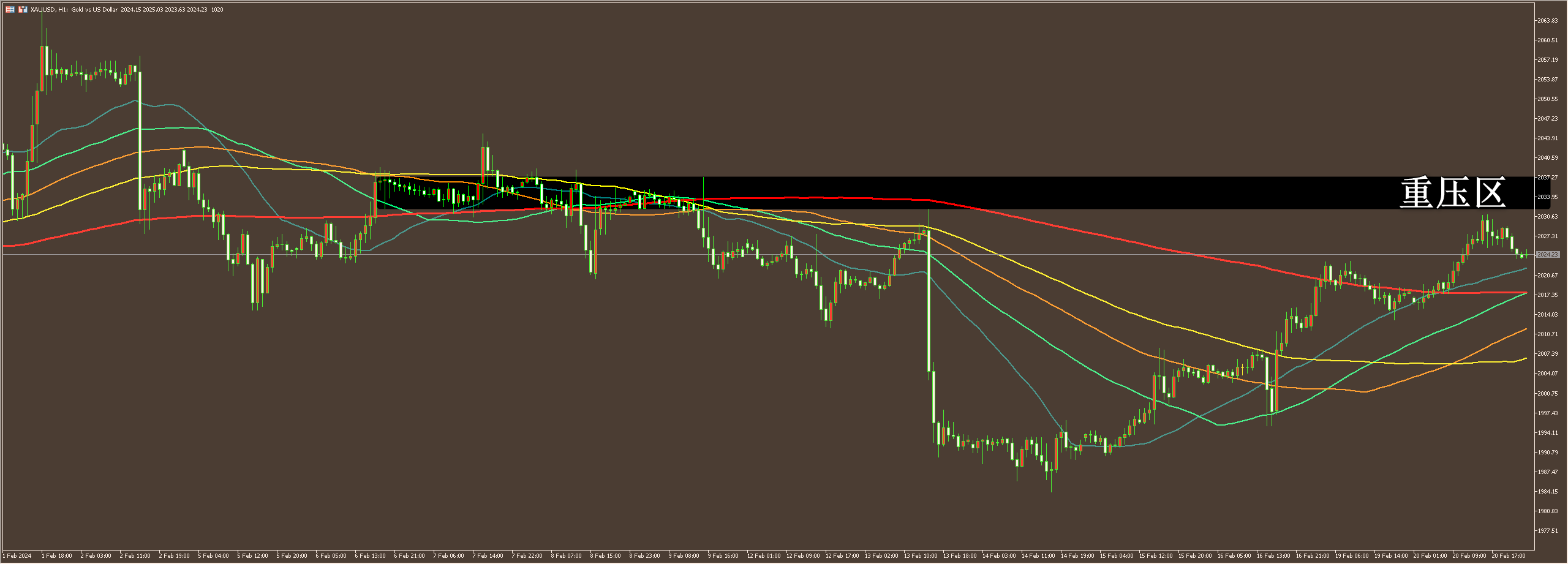 通过对黄金小时图解析得知,黄金从早盘到目前为止继续向上反弹,我们从下方的附图可以清楚的看到,自从在下方1984一线出现了中短长期筹码集中以来行情一路震荡上行,目前即将到达上方1号压力位(2024一线)虽然短期反弹的力道比较强悍但是依然是在重要均线的压制之下运行,短期上方我们继续重点关注12号的均线压制,早盘
