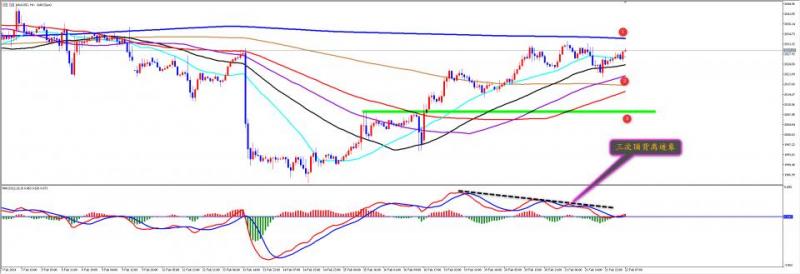通过对黄金小时图解析得知,黄金从早盘继续小幅反弹,我们从下方的附图可以清楚的看到虽然短期一直都是在零轴上方运行,但是多头能量柱已经出现了严重不足的迹象,并且已经出现了三次顶背离动作,短期非常有可能再次向上反弹一下形成诱多动作,短期上方我们做嗲你关注1号均线的压力即可,突发事件除外,冲高回落的可能性