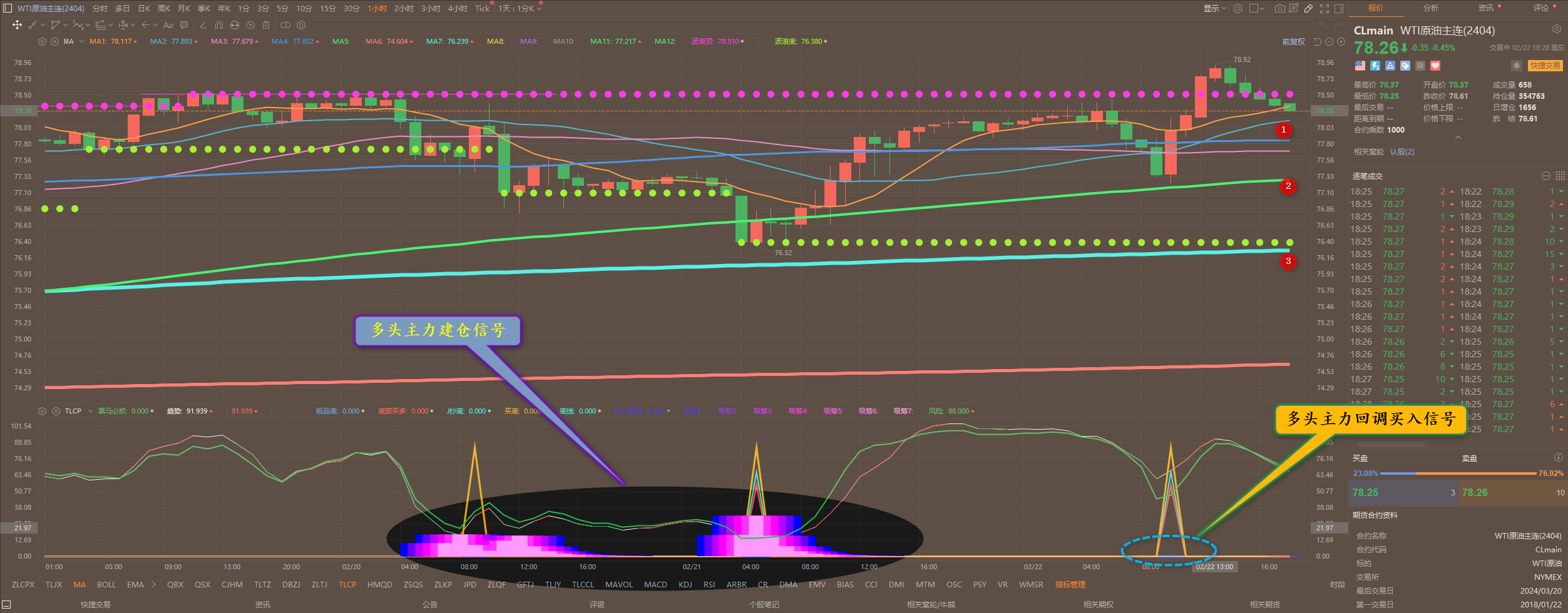 通过对原油小时图解析得知,昨日行情先涨后跌继续延续回落调整走势,我们从下方的附图可以清楚的看到,在下方75.80一线出现了多头主力建仓的信号,短期下方我们重点关注12号的均线支撑,行情继续向上运行突破的可能性比较大,上方我们继续重点关注3号的压力位即可一旦放量突破将会加速拉升,短期在操作上我们继续高空低