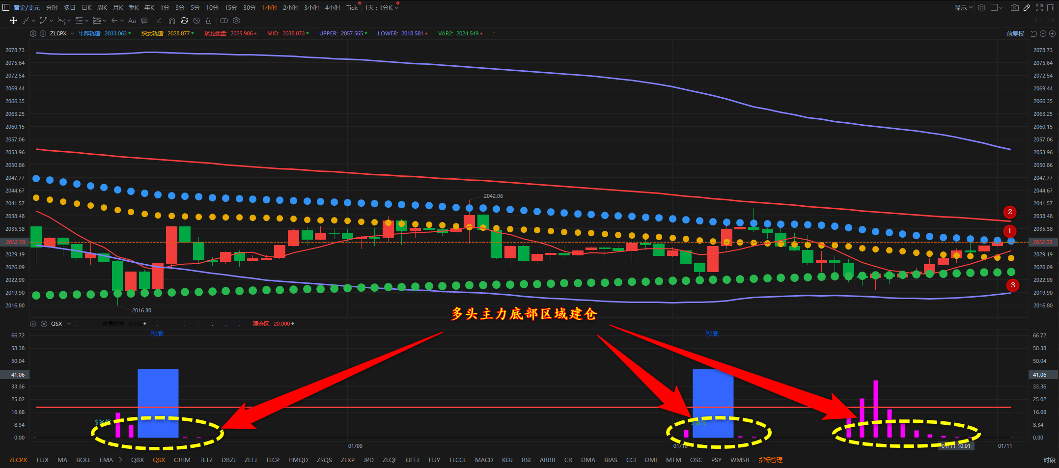 通过对黄金小时图解析得知,昨日行情先涨后跌再上涨,盘中再次形成窄幅震荡调整走势,晚间一度到达下方2013一线附近,我们从下方附图可以清楚的看到晚间这次出现筹码的压缩,我们从历史经验中发现压缩空间一旦形成并且到达极限就会出现急速反弹动作,在前期基础底部区域的时候都相对而言出现了不错的反弹动作,昨日晚间
