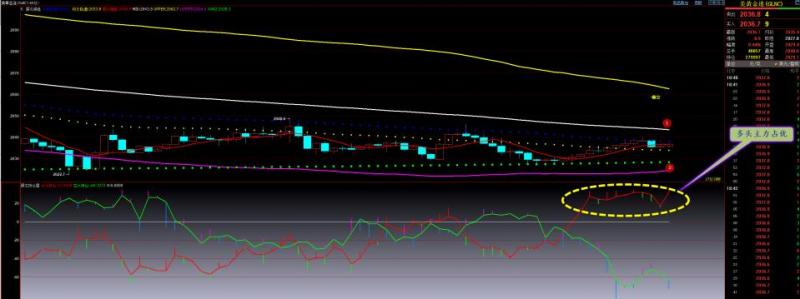 通过对黄金小时图解析得知,黄金从早盘一路震荡上行在上方2035一线受阻回落从主图中我们可以清楚地看到多头主力占优并且处于高度控盘的状态,晚间非常有可能进一步的实现突破上方的布林带中轨的压力,但是也不排除受数据影响继续回落下方2号均线的支撑,短期在操作上我们继续高空低多思路,重点下来了逢低做多,具体建议