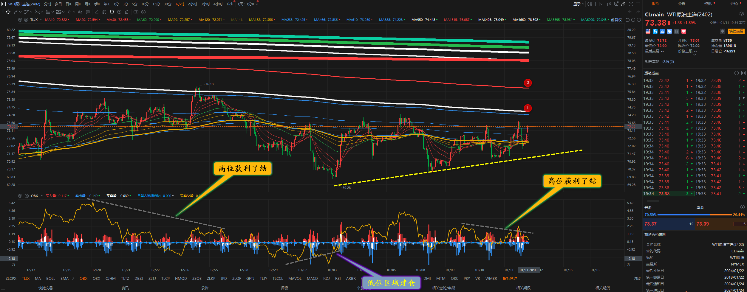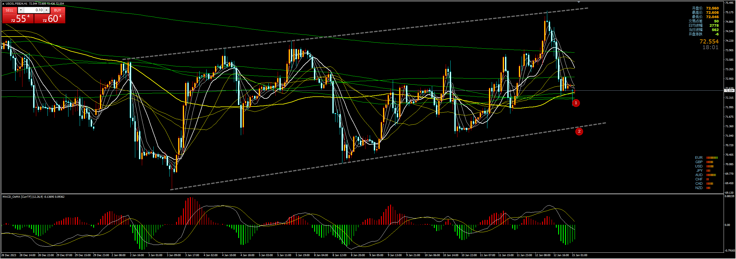 通过对原油小时图解析得知,上一个交易日原油先涨后跌早盘到达下方1号均线的支撑位出现了止跌反弹动作,短期整体行情依然依托上升趋势通道呈现震荡上行走势,短期我们重点关注下方1号和2号趋势线的支撑,短期继续延续向上的可能性比较大一点在操作上我们继续重点逢低做多,具体建议如下: 原油72.00和71.50分别