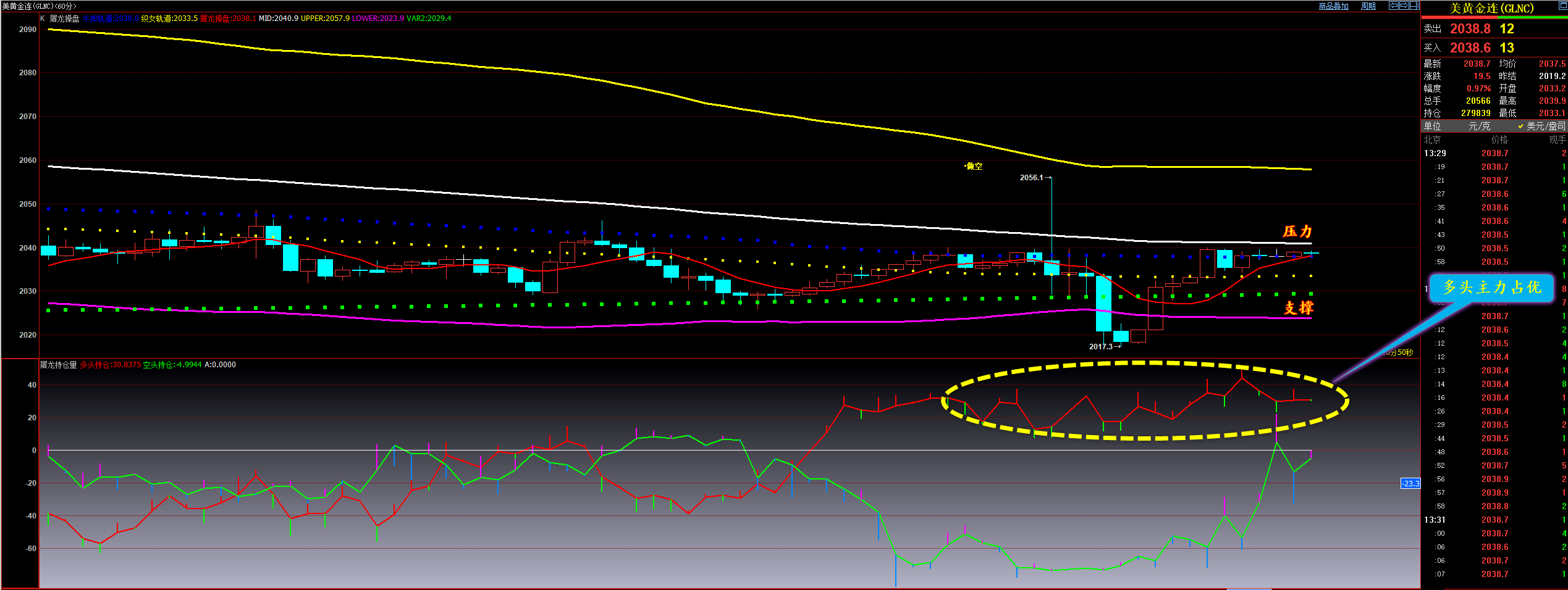 通过对黄金小时图解析得知,上一个交易日黄金先涨后跌,整体继续延续上涨走势,我们从下方的附图可以清楚的看到在横盘震荡调整期间多头主力再次增仓介入并且在下方20日均线的位置得到了有效的支撑说明行情还要继续向上运行,短期上方我们继续关注2063一线的阻力位,下方我们继续重点关注2041一线的支撑,短期在操作上我