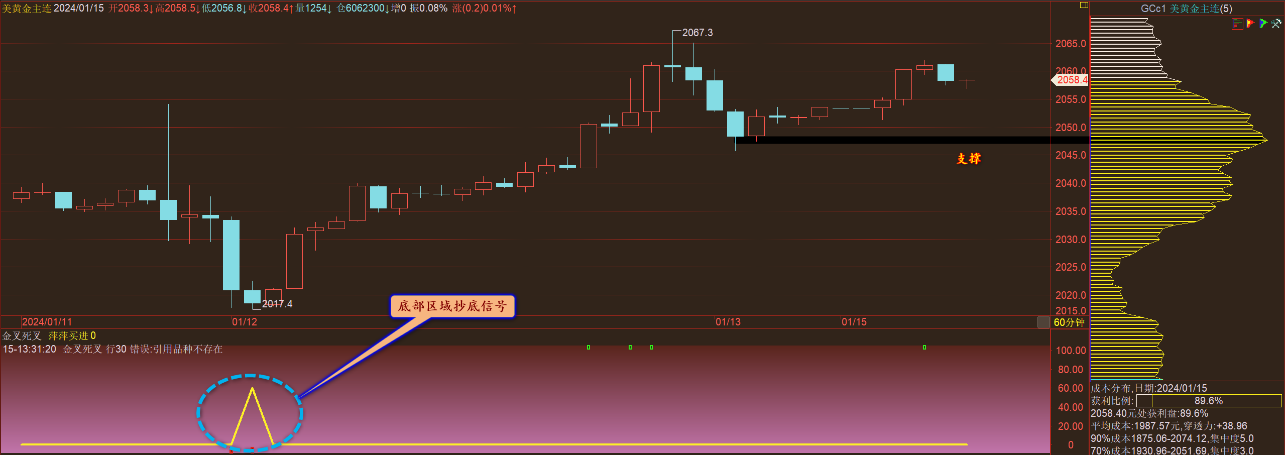 通过对黄金小时图解析得知,黄金从早盘到目前为止继续反弹中,我们从下方的附图可以清楚地看到,自从在下方出现了底部区域抄底信号行情一路拉升突破重重压力,短期在上方2062一线受阻回落,在下方2041一线止跌反弹(右侧筹码峰值的位置)目前已经反过来成为支撑,短期上方2062一线依然是压力,一旦放量突破就会到达上方20