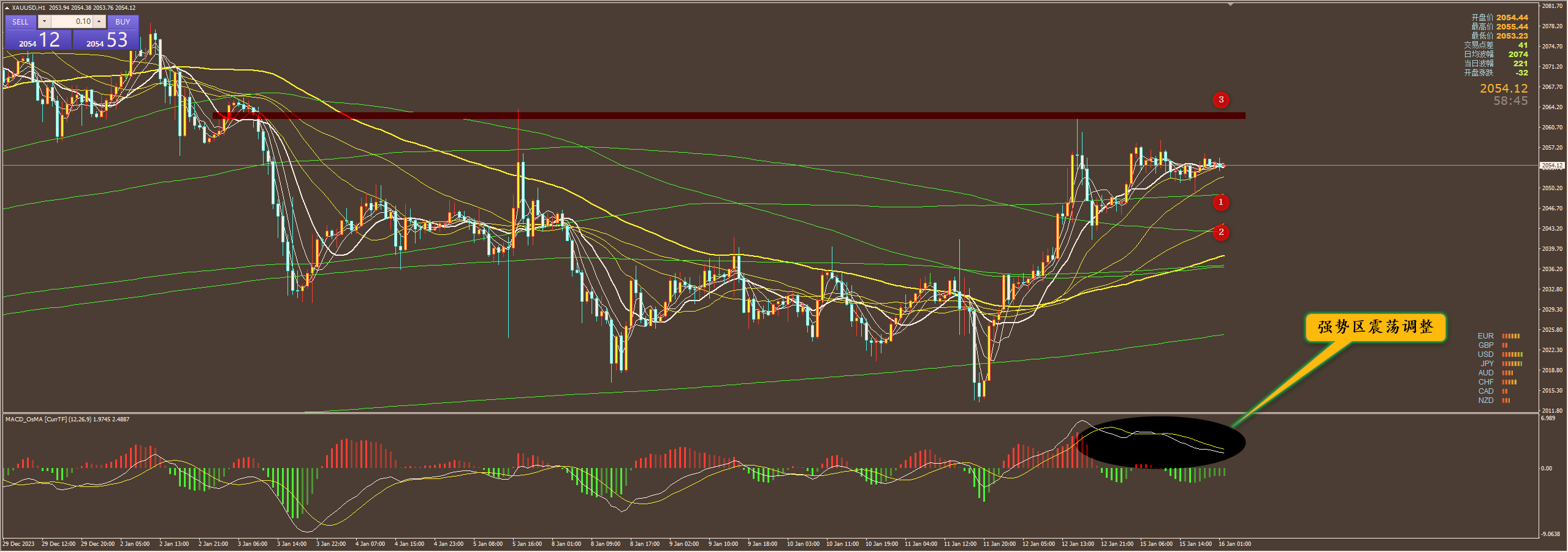 通过对黄金小时图解析得知,昨日行情先涨后跌再上涨形成窄幅震荡调整走势,在下方1号均线的支撑位止跌反弹,我们从下方的附图可以清楚的看到目前依然是在ACD的零轴上方运行说明短期属于强势调整状态,虽然多头力道有所欠缺但是多头意愿比较强烈,短期我们继续重点关注上方3号的压力位,下方我们继续重点关注12号的支撑,