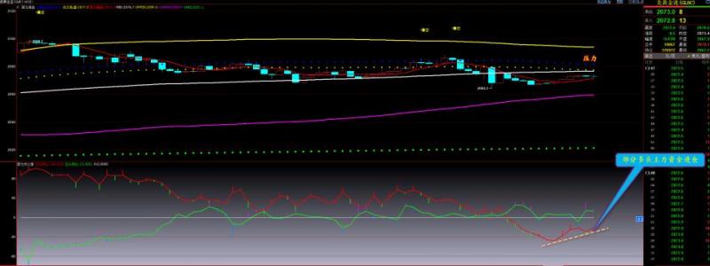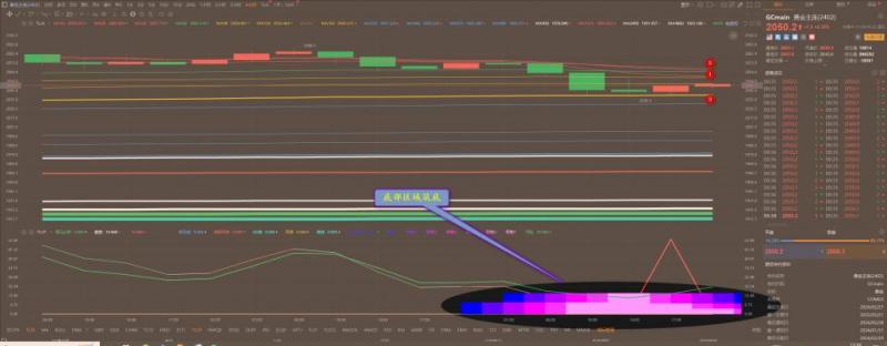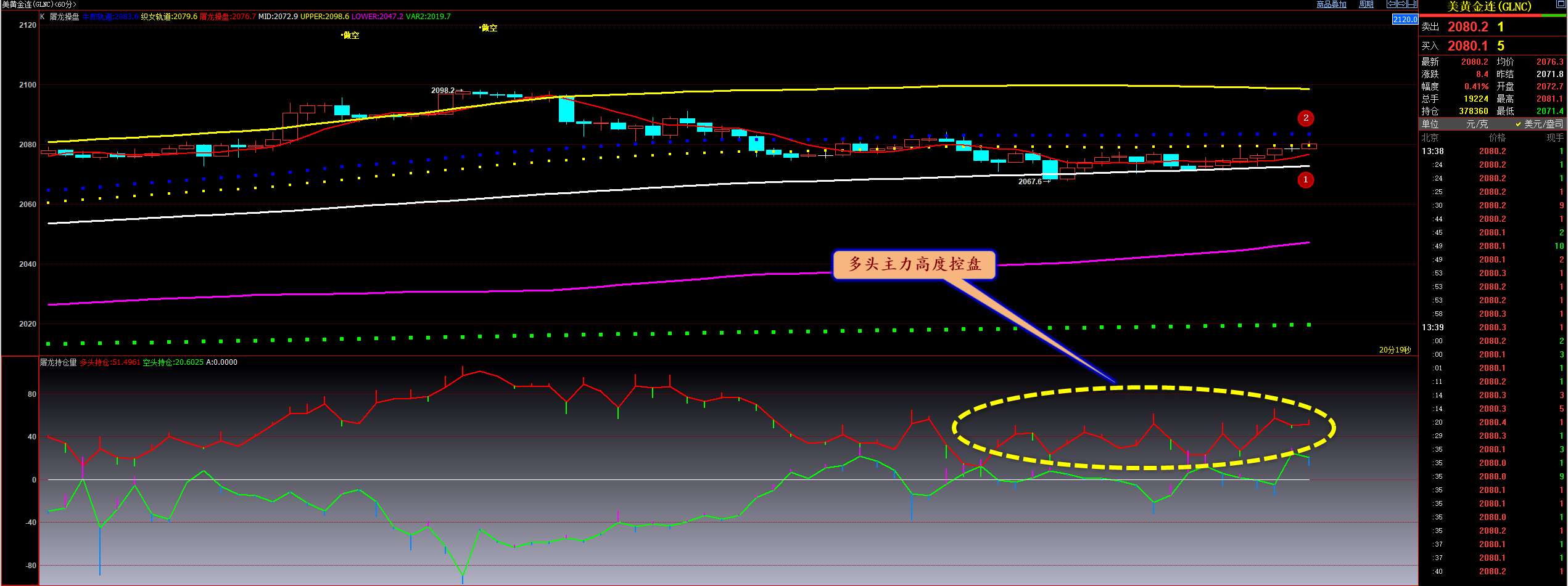 通过对黄金小时图解析得知,昨日行情先涨后跌,继续延续下跌走势,行情之所以会出现冲高回落动作我们从下方的附图可以清楚的看到在昨日反弹至上方2079一线出现了多头主力大量出逃迹象从而导致行情反弹无力,目前有所反弹,可以清楚的看到多头主力只是一部分资金进仓,预计将会继续横盘震荡调整运行以时间换空间,短期我