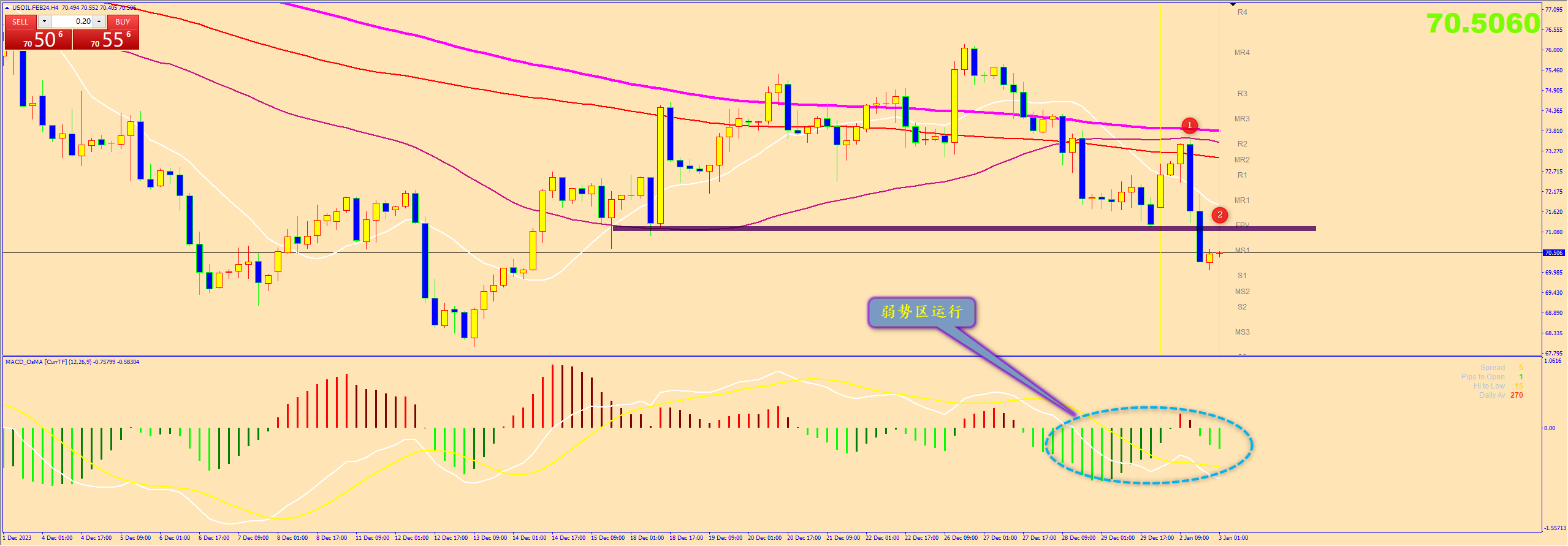 通过对原油4小时图解析得知,昨日行情先涨后跌后续延续下跌走势,从主图中我们可以清楚的看到昨日反弹至上方1号均线压力位受阻回落目前小幅反弹中,我们从下方的附图也可以清楚地看到下方ACD依然是在零轴下方运行虽然下跌动能柱有所缩短但是目前还不能改变下跌的命运,短期上方我们重点关注12号的压力即可,下方我们重点