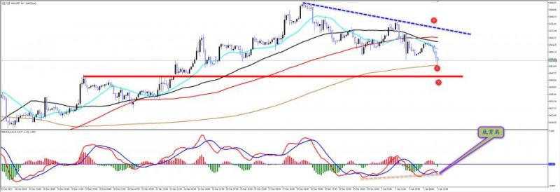 通过对黄金小时图解析得知,黄金从早盘先反弹到2066附近,冲高回落目前已经到达下方1号均线的支撑位,我们从下方的附图ACD可以清楚的看到已经出现了底背离迹象,但是不排除进一步下探达到下方2号支撑位前期的反弹高点位置,短期上方3号趋势线的压制也是比较关键的对后期的进一步上涨起到支撑作用,目前短期在操作上我们