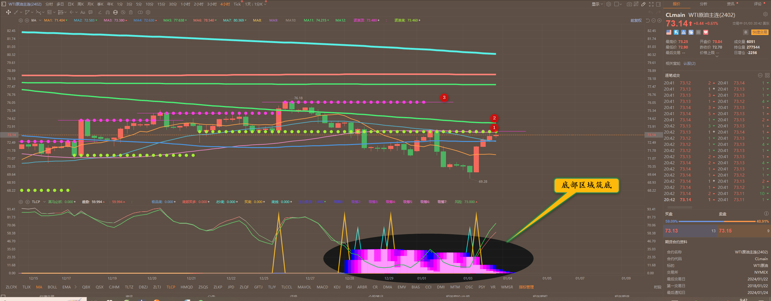 通过对原油4小时图解析得知,昨日行情先涨后跌再上涨盘中形成宽幅震荡走势基本上把上一个交易日的下跌已经全部收复失地,我们从下方的附图可以清楚的看到近2个交易日在底部区域出现了筑底的动作,短期上方依然受制于均线的压制我们重点关注12号的均线,一旦放量突破就会到达上方前期的反弹高点3号位置,短期在初操作上我