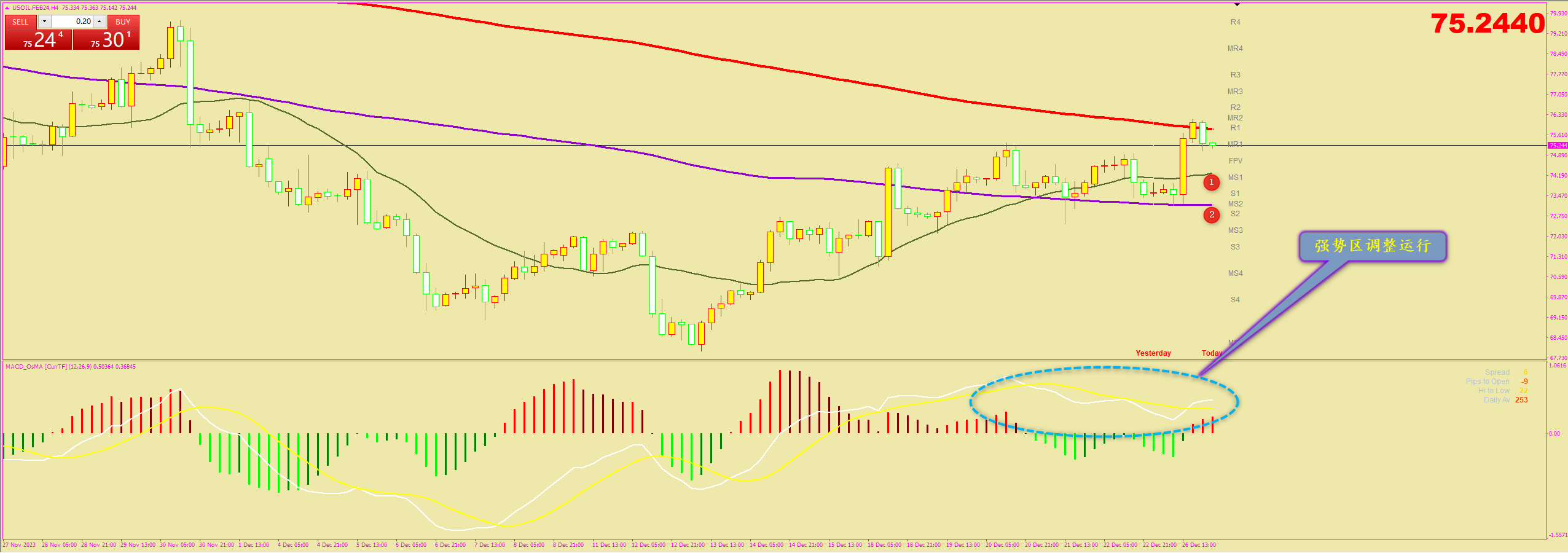 通过对原油小时图解析得知,昨日行情先涨后跌,目前在下方布林带中轨的支撑位附近止跌反弹,我们通过下方的附图可以清楚地看到在下方再次出现回调买入信号,上一次在72.40一线的布林带中轨的位置附近出现了多头主力建仓动作盘中小幅反弹了一波,目前再次出现相对而言也是要反弹一波,短期上方我们继续关注75.40和76.60一