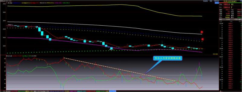 通过对黄金小时图解析得知,昨日黄金冲高回落没有延续反弹走势继续回落至下方1977一线,我们从下方的附图可以清楚地看到已经连续几个交易日多头主力资金处于大量出逃状态是主要影响行情的走势,到目前为止依然是出逃状态说明短期不具备反转要求,短期继续震荡调整的可能性比较大即使要反转多头主力也要以时间换取空间的