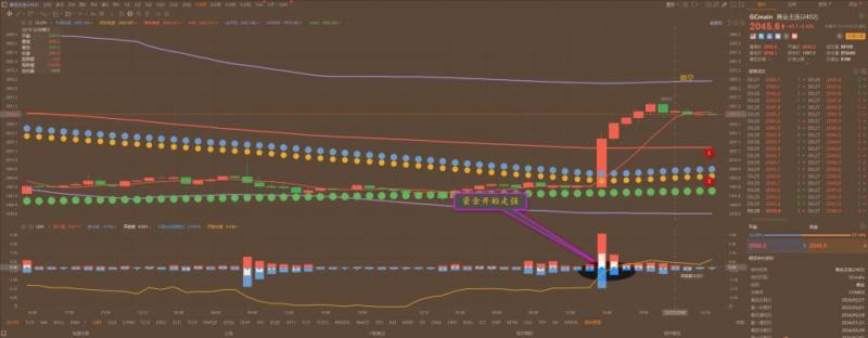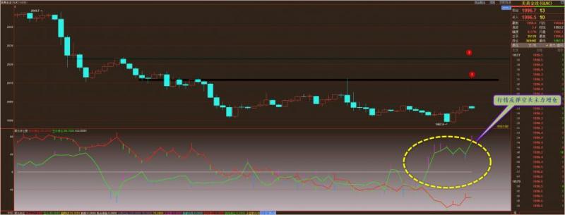 通过对黄金小时图解析得知,昨日行情继续延续上涨走势,晚间到达2048一线冲高回落,我们从下方的幅图可以清楚地看到前期在在不区域的时候多次说过多头主力在下跌的过程中不断地增仓介入在底部区域形成严重底背离迹象,而昨日我们可以清楚地看到多头主力有获利减仓动作,从而从中获取收益,同时短期也是得要有一个技术性