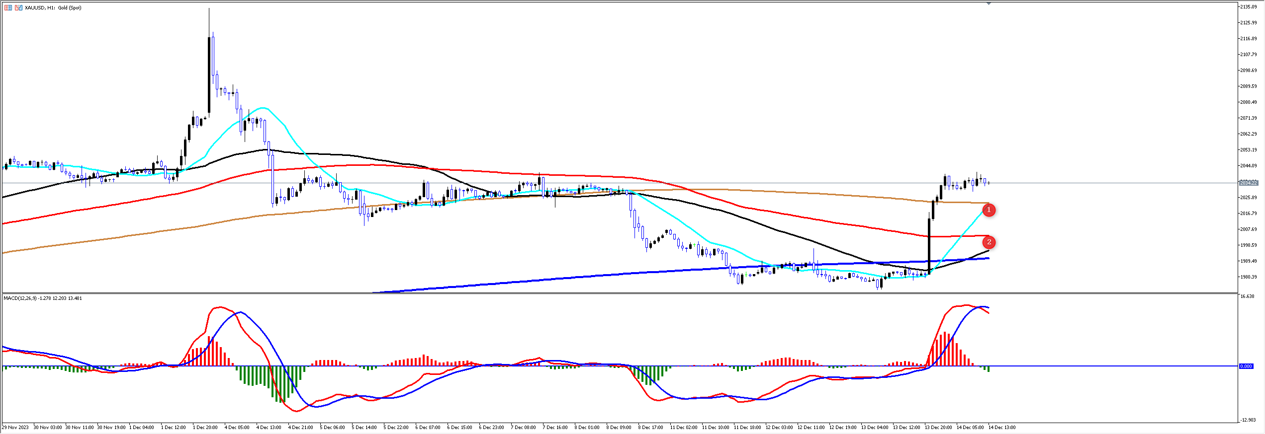 通过对黄金小时图解析得知,昨日行情先跌后涨,在下方1973一线的均线支撑止跌企稳,凌晨手鲍威尔讲话影响拉升启动,我们从下方的幅图可以清楚的看到前两个交易日多从出现进仓信号,在前期底部位置的是都相对而言都出现了一波反弹上涨动作,短期即将到达前期反弹的高点1号位相对而言也是要调整一下继续震荡上行突破。前几
