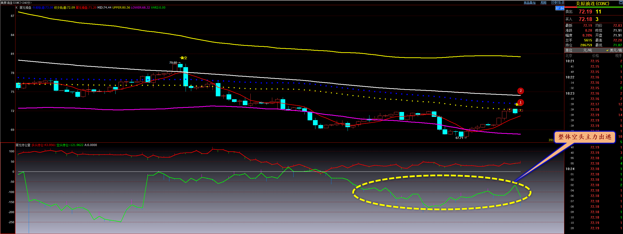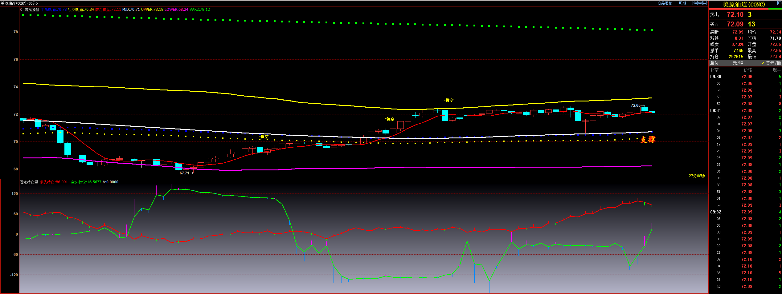 通过对原油小时图解析得知,昨日行情先跌后涨目前已经接近双轨和布林带中轨的压力,我们从下方的附图可以清楚的看到在下方67.70一线出现了超级主力抄底动作一路反弹,目前接近压力位附近下方已经出现了机构获利减仓动作,相对而言得要冲高回落一下,短期上方依然受制于中轨压制,必须得要放量突破并且站稳后期才会继续向