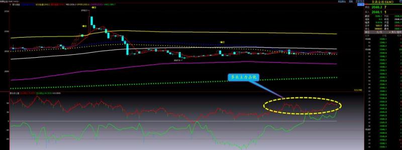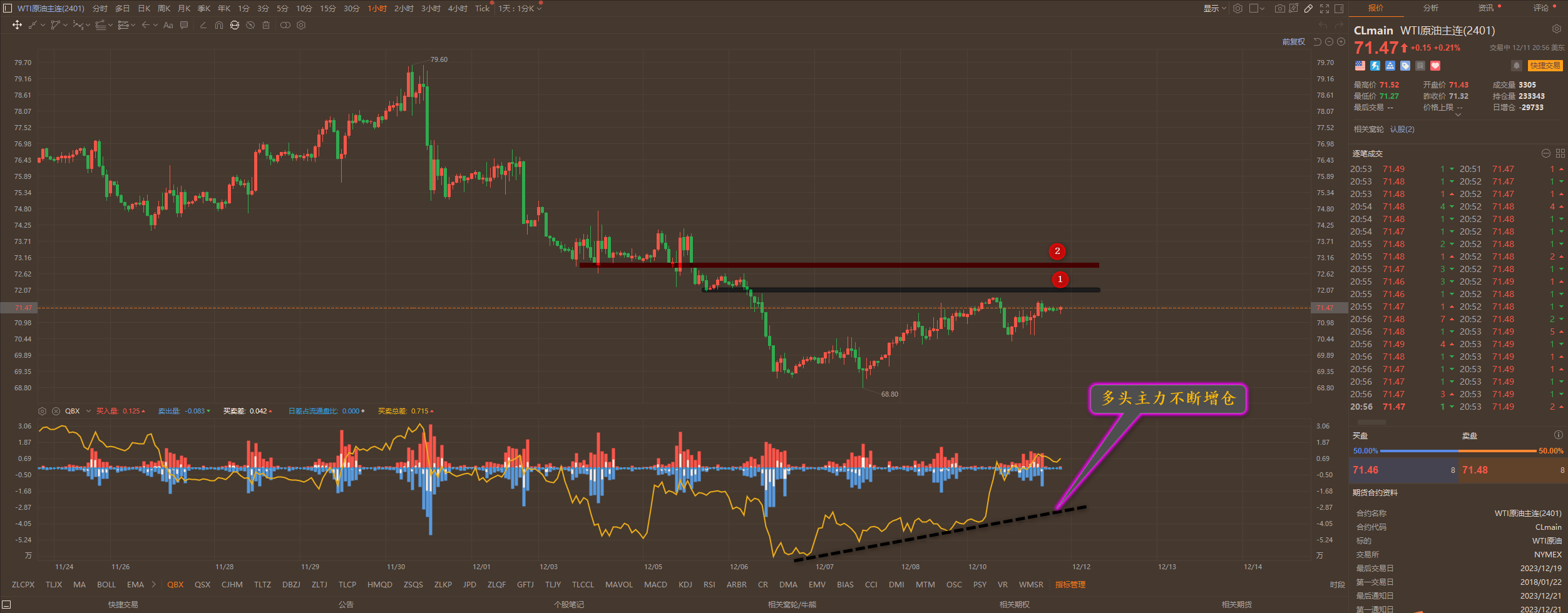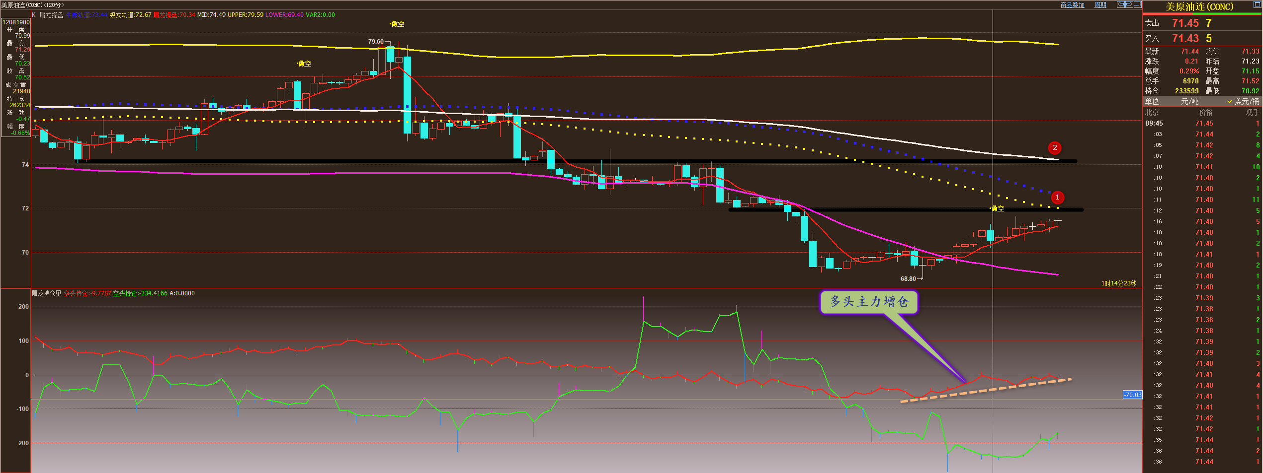 通过对原油2小时图解析得知,昨日行情继续延续反弹走势目前即将到达上方1号双轨的压力(72.00一线),我们从下方的附图可以清楚的看到连续2个交易日多头主力持续增仓的状态,目前接近压力位附近同时也出现一部分空头主力进仓迹象短期上方我们重点关注12的压力,短期大方向依然是下跌不变,目前还不具备反转形态短期应该