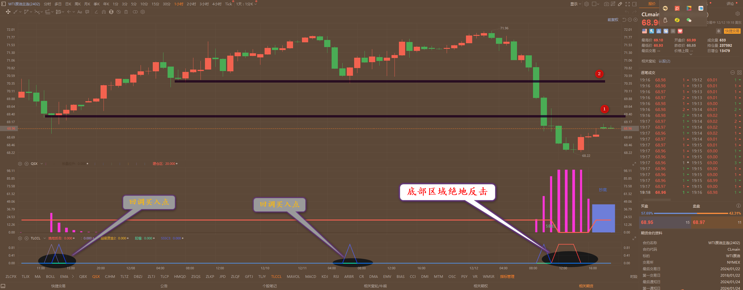 通过对原油小时图解析得知,昨日行情先涨后跌晚间一度创新低到达下方68.20一线目前小幅反弹过程中,我们从下方的幅图可以清楚地看到目前已经出现底部信号并且下方出现绝地反击信号,在前期回调的阶段性底部区域的时候都相对而言小幅反弹了一波,目前再次出现预计将会继续反弹一波,短期上方我们重点关注12号的压力位,短