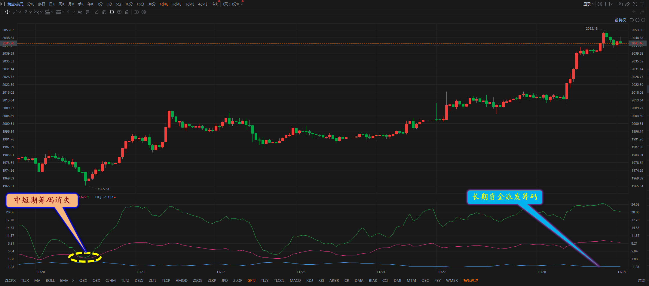 通过对黄金小时图解析得知,黄金从早盘冲高回落以来到目前为止一直是处于窄幅震荡调整状态,我没从下方的附图也可以清楚的看到在前期1989一线的底部区域出现大黑抓抄底信号行情从而拉升了一波,今日在早盘高位小幅附图显示有几个减仓信号,目前虽然调整幅度不大但是短期还是有一定的影响,短期下方我们重点关注上升趋势