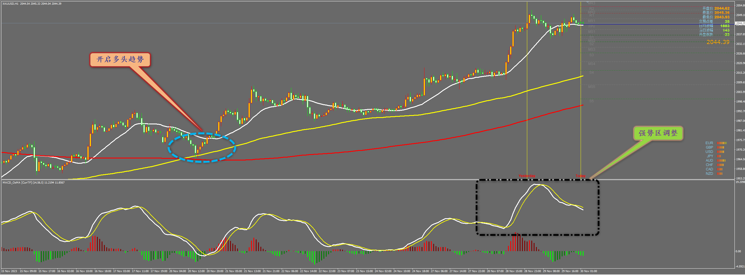 通过对黄金小时图解析得知,昨日行情先跌后涨继续在高位窄幅震荡调整,自从均线系统从下方开始突破站稳并且形成多头趋势一路向上震荡上行突破,目前已经接近昨日所说的2062一线的压力位,短期我们从下方的幅图也可以清楚地看到目前在零轴上方运行虽然有开口向下运行的动作但是一直保持比较强势的节奏,短期有进一步突破