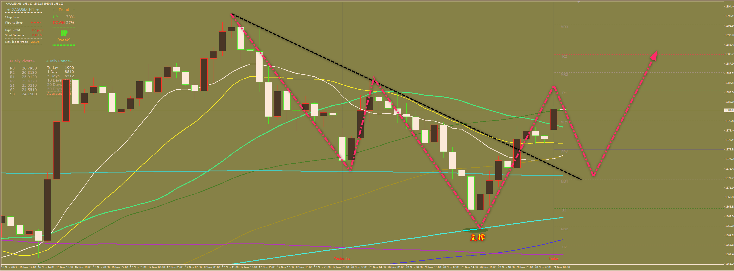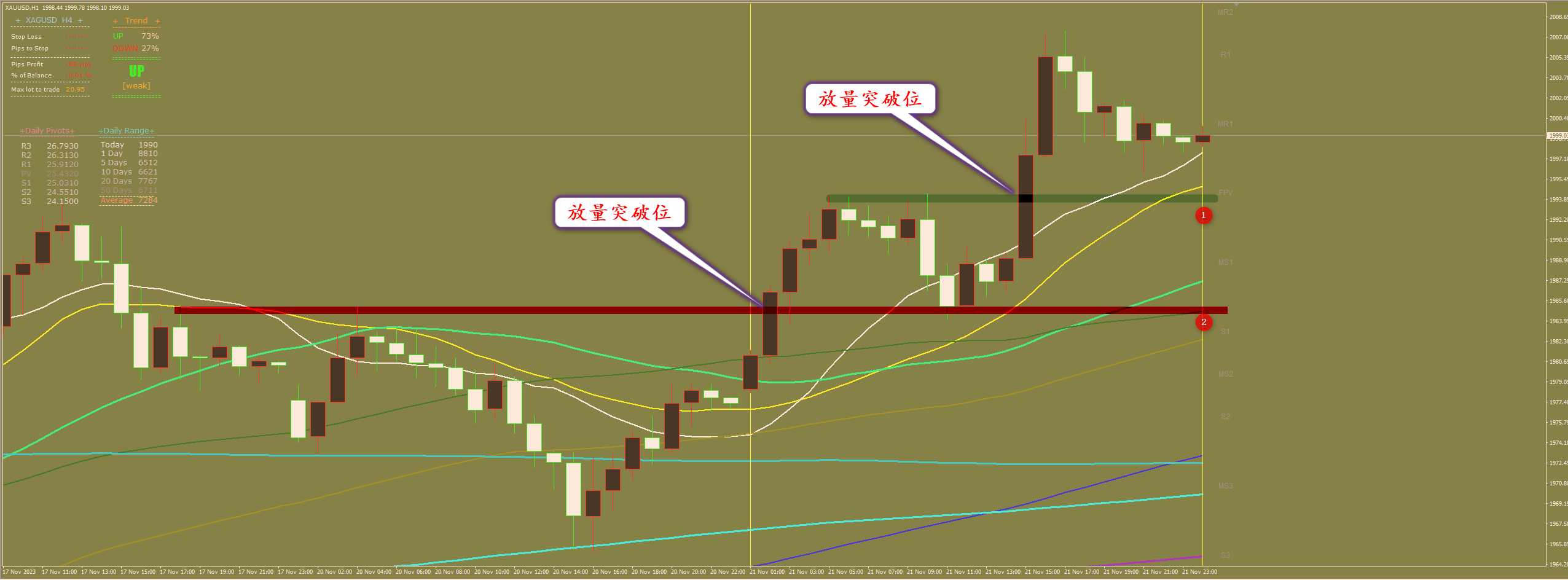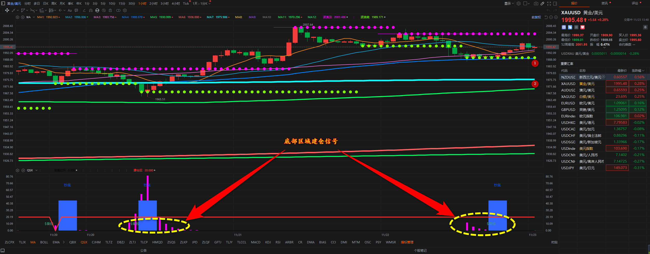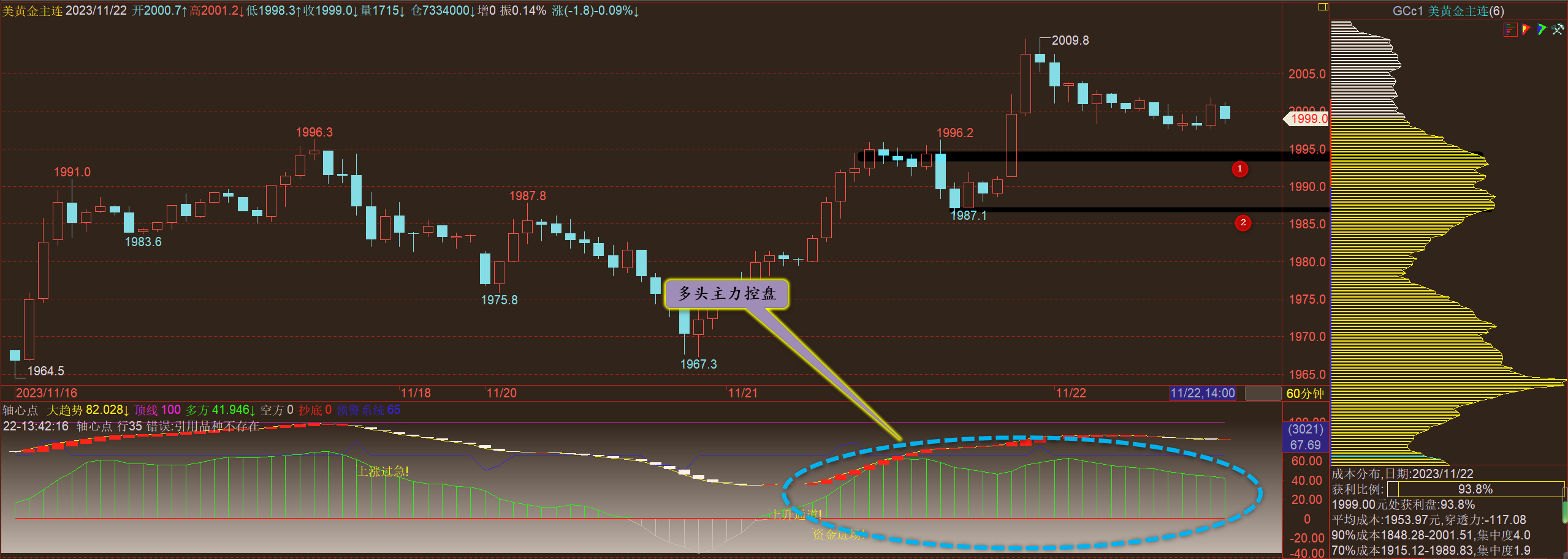 通过对黄金小时图解析得知,黄金从早盘小幅反弹在上方1998一线受阻回落,我们从下方的附图可以清楚的看到昨日晚间到达下方1987一线出现了多头主力建仓动作,目前不排除继续回落调整到达下方12号均线的支撑位,加上今天是感恩节晚间行情波动不大,盘中我们注意一下操作节奏即可,短期在操作上我们继续重点逢低做多,具体