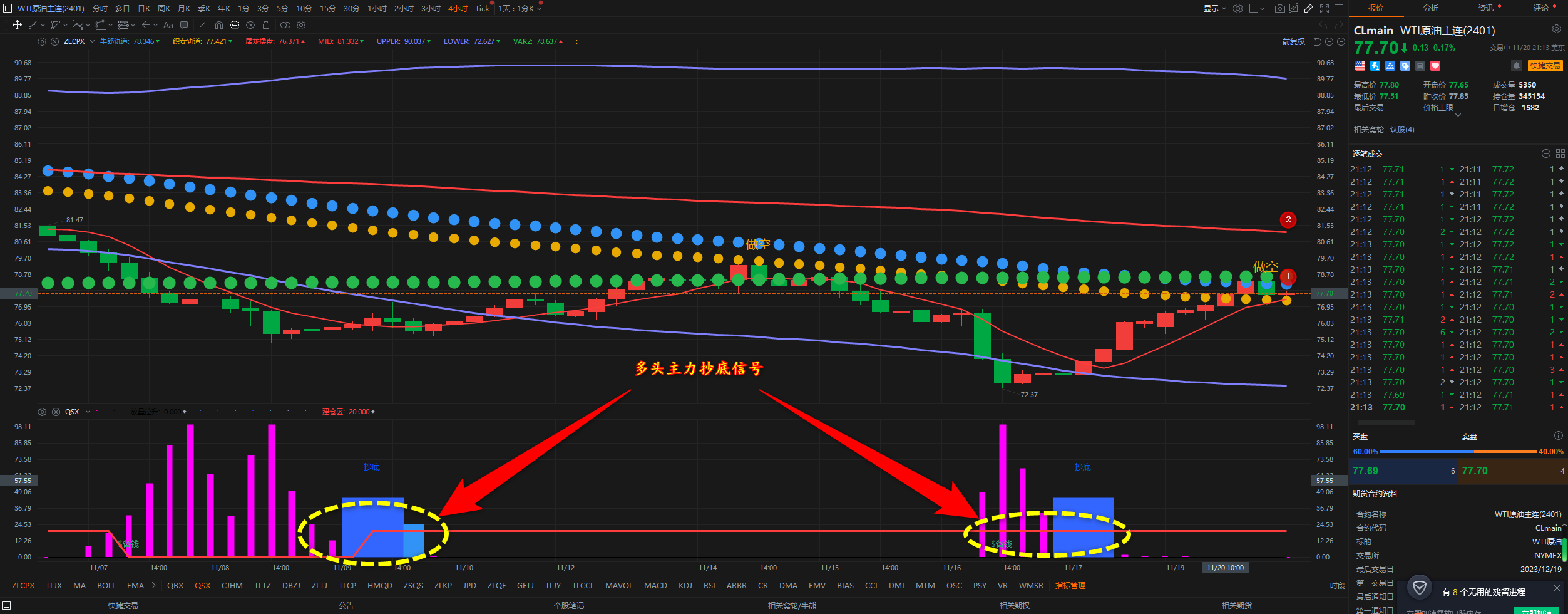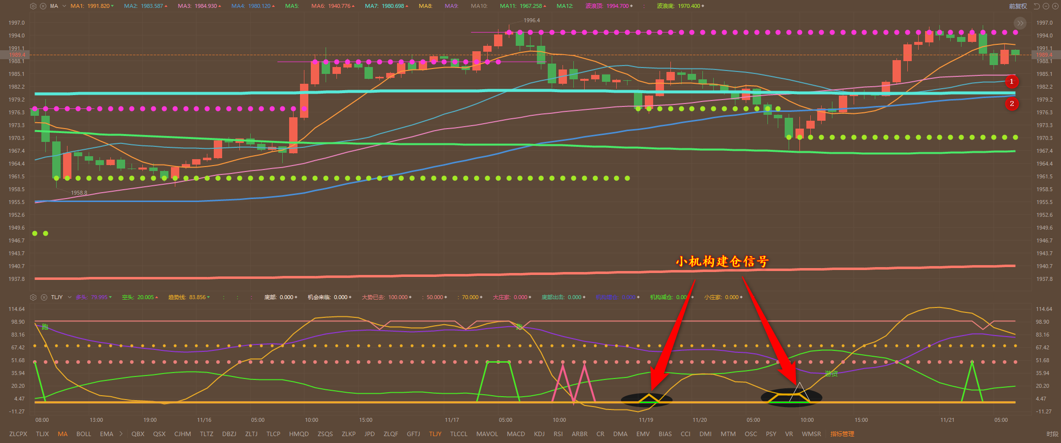 通过对黄金小时图解析得知,黄金从早盘反弹到1994一线冲高回落,我们从下方的幅图可以清楚地看到近2个交易日都在阶段性底部位置相对而言都出现小机构抄底信号,在盘中都出现小幅反弹动作,目前短期我们重点关注下方12号均线的支撑位即可,预计调整结束之后机会继续向上运行上方我们的目标位2020依然不变,在操作上我们继