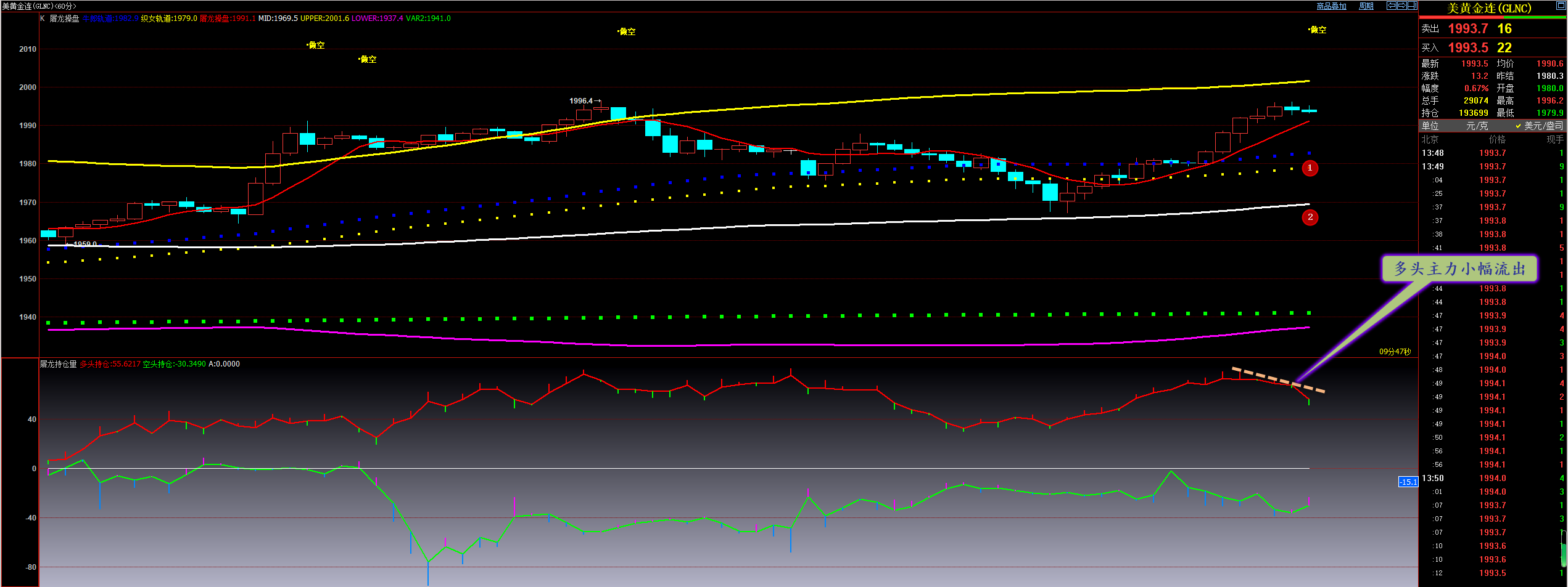 通过对黄金小时图解析得知,黄金从继续延续反弹,目前再次在上方1994一线受阻回落,我们从下方的附图可以清楚的看到到达是否压力位之后多头主力有部分主力获利减仓动作,从主图中我们可以清楚地看到自从站上布林带中轨行情一直处于震荡上行的状态昨日再次在布林带中轨附近止跌反弹说明多头主力依然比较强烈加上多头主力