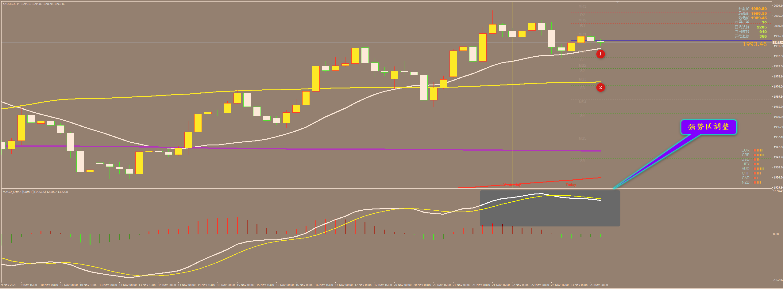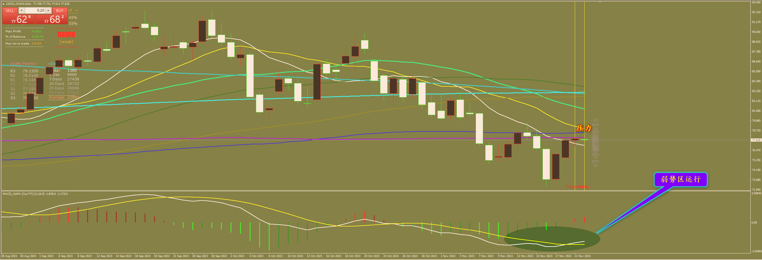 通过对黄金4小时图解析得知,黄金从早盘到目前为止一直窄幅震荡调整运行,受感恩节休市影响盘中波动不大,目前已知沿着1号均线继续震荡上行,,我们从下方的幅图可以清楚地看到ACD在零轴上方调整运行,说明短期属于强势调整行情,但是盘中不排除进一步下探到达下方2号均线支撑位.短期上行突破的可能性比较大一点。在操作