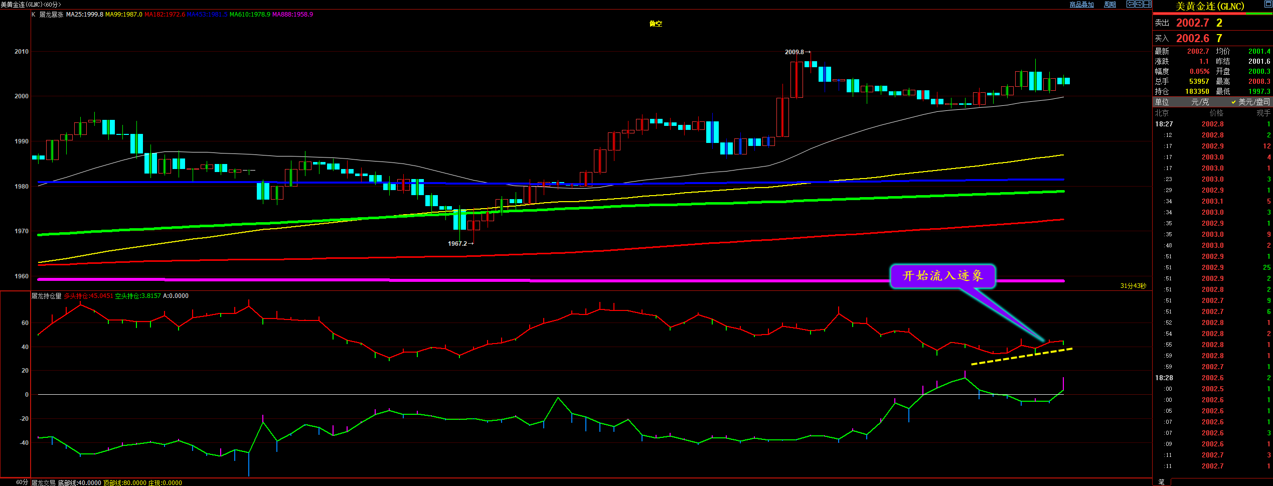 通过对黄金小时图解析得知,黄金从早盘到目前为止一直在高位窄幅震荡调整运行小妹中午的时候说过行情近2个交易日有冲高出货动作,目前依然是在横盘震荡调整的时候我们看到有小幅资金介入动作,但是还没有加速介入,不过整体多头主力依然是出于比较强势的状态,预计美盘时段机会继续上行突破,短期上方我们继续关注2008和
