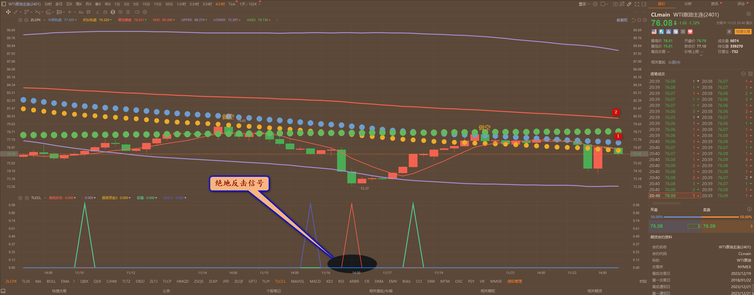 通过对原油4小时图解析得知,原油继续延续反弹走势晚间到达上方双轨的压力位受阻回落,目前依然回落调整中,自从在下方连续出现多头主力抄底信号以来都相对而言小幅反弹一波,目前相对而言应该是还要继续震荡调整一下但是也不排除进一步反弹到达上方布林带中轨的压力(2号位),短期在操作上我们继续高空低多思路,具体