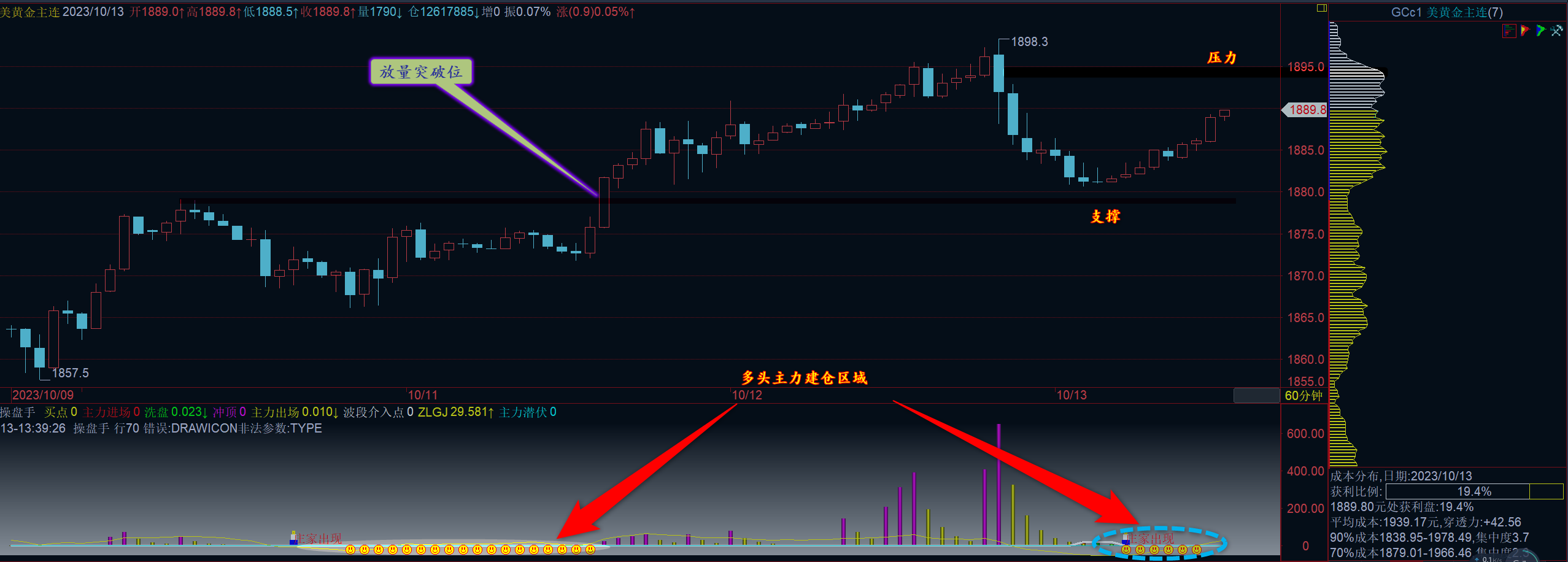 通过对黄金小时图解析得知,黄金从早盘到目前为止继续向上反弹,我们从下方的附图中可以清楚的看到在前期1862一线横盘震荡调整期间,出现了多头主力建仓信号,从而形成一波拉升动作,,昨日晚间再次在下方发现多头主力建仓动作,目前依然是处于反弹拉升中,短期上方我们继续重点关注,1884一线的压制即可,下方继续重点