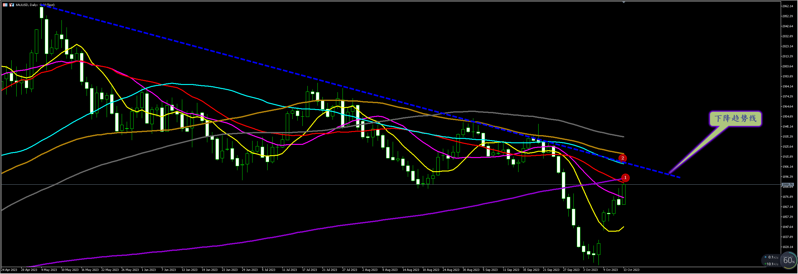 通过对黄金日线图解析得知,黄金从早盘到目前为止继续突破创新高,目前已经到达1号均线压力位(30日均线),目前整体行情依然是属于反弹过程中一直是在前期的下降趋势线下方运行,前期连续12个交易日的下跌,目前已经反弹6个交易日,虽然反弹的力度比较大但是上方压力重重,短期上方依然受制于均线系统的压制,短期小妹