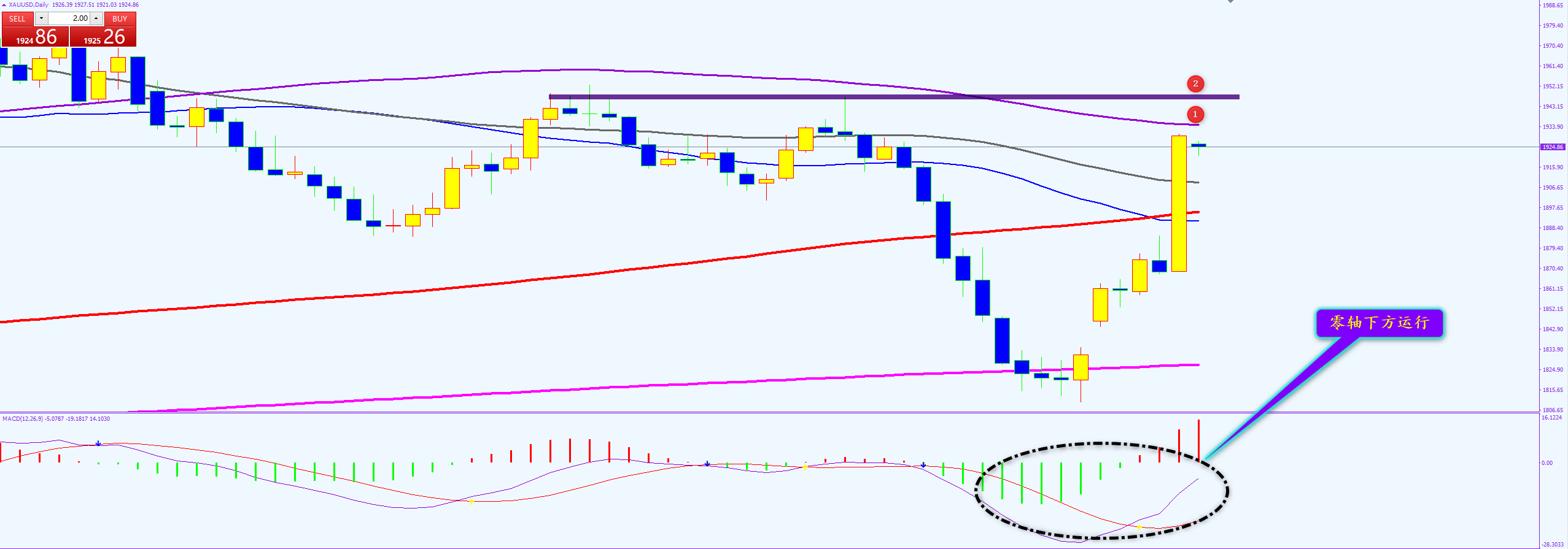 通过对黄金日线图解析得知,上一个交易日黄金继续延续上涨突破走势晚间一度到1930一线的压力位,今日低开低走,这两天中东局势相对而言有所减缓,但是还不能完全解除安全,受地缘政治影响短期也是非常有可能进一步的反弹拉升,我们从下方ACD也可以清楚的看到短期依然是在零轴下方运行还没有收复失地,不过近6个交易日的
