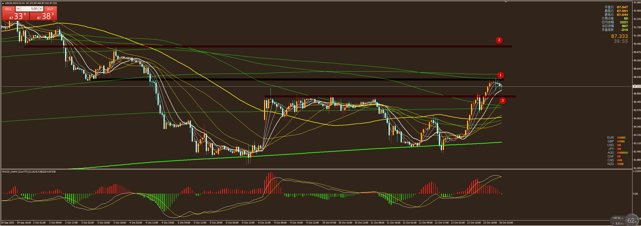 通过对原油小时图解析得知,原油早盘在上方的一号均线压力位冲高回落,上一个交易日受中东事件影响继续延续上涨走势,短期已经突破3号前期的压力位,目前反过来已经成为支撑,从下方ACD也可以清楚的看到到达压力位附近多头能量柱有所减缓,相对而言应该是要回调下方的支撑位对后期进一步的拉升突破起到关键作用,短期在
