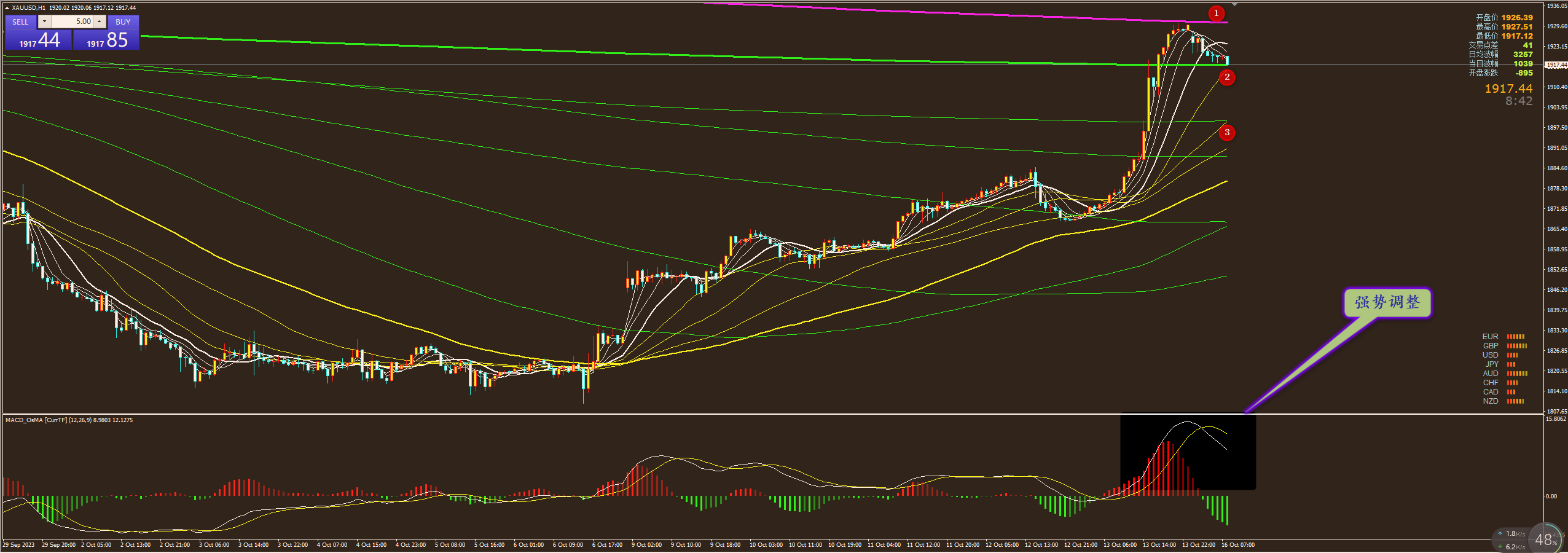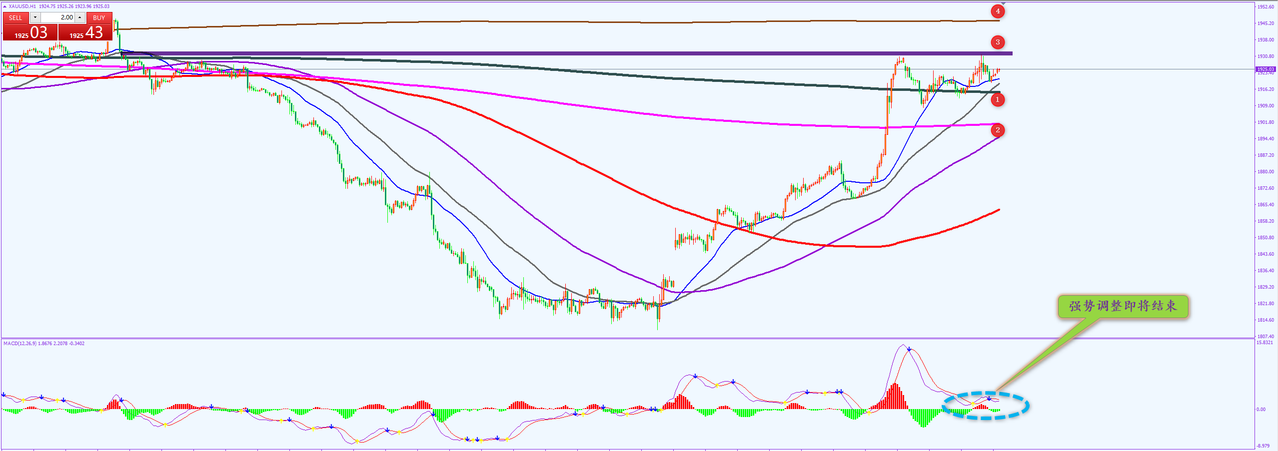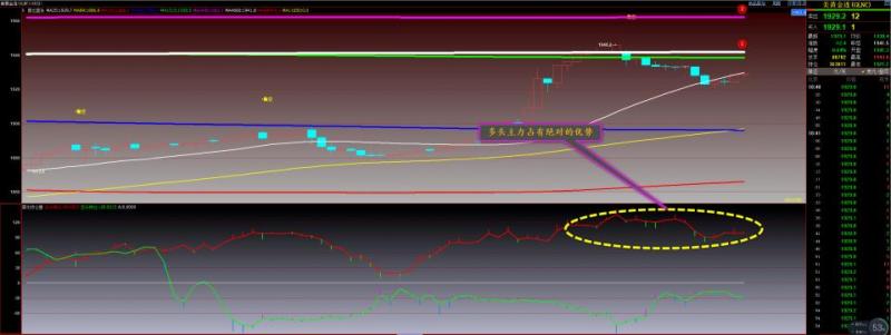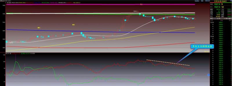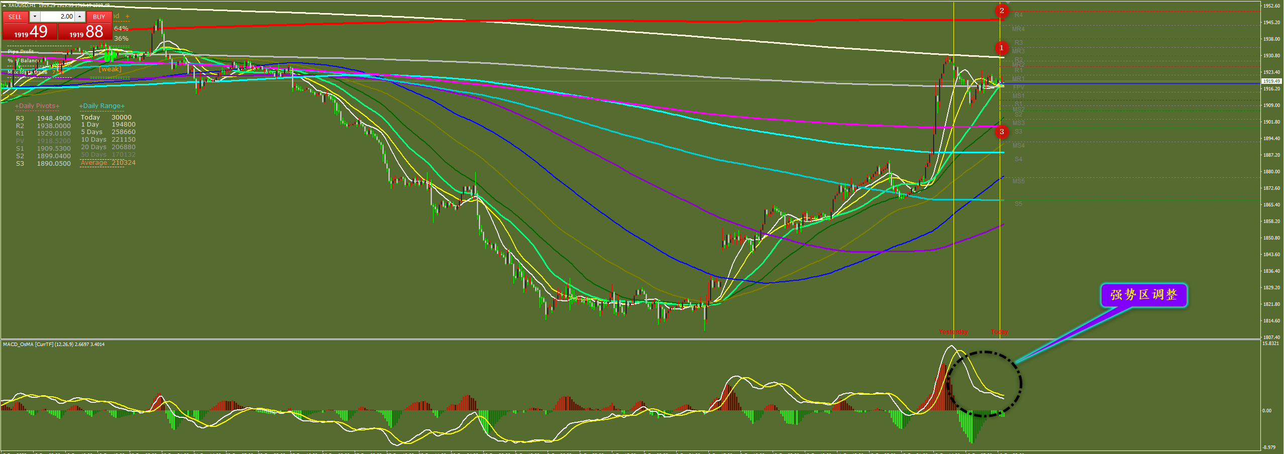通过对黄金小时图解析得知,昨日行情在上方1号均线的压力位冲高回落,在下方1908一线止跌反弹,整体在高位形成窄幅震荡调整动作,我们从下方的ACD来看目前依然是在零轴上方运行属于强势调整行情,短期的上涨势头不变,虽然在日线级别属于反弹动作受中东事件影响短期的多头主力依然是控盘状态,短期进一步上涨的可能性比