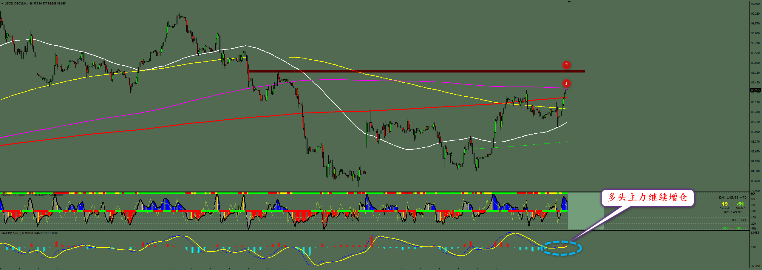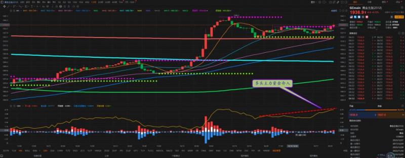 通过对黄金小时图解析得知,黄金从早盘到目前为止继续震荡偏上行如中午所说有进一步实现突破的可能性,我们从下方的附图可以清楚的看到多头主力资金不断地增仓介入虽然力道不足,多头主力非常有可能借助数据突飞猛进进一步拉升突破,短期我们继续重点关注上方关注1933一线的压制即可,下方我们继续关注1910一线的支撑,