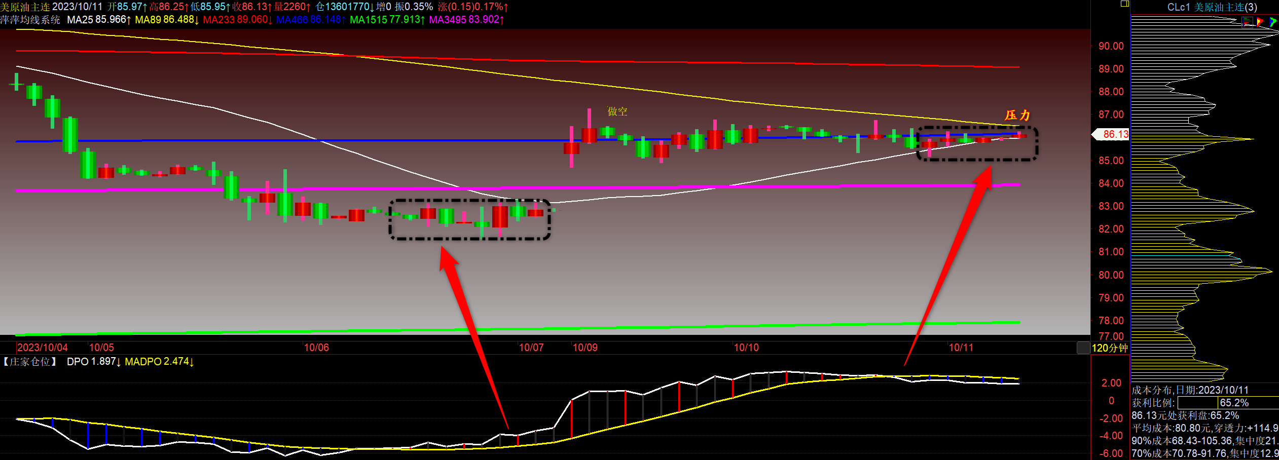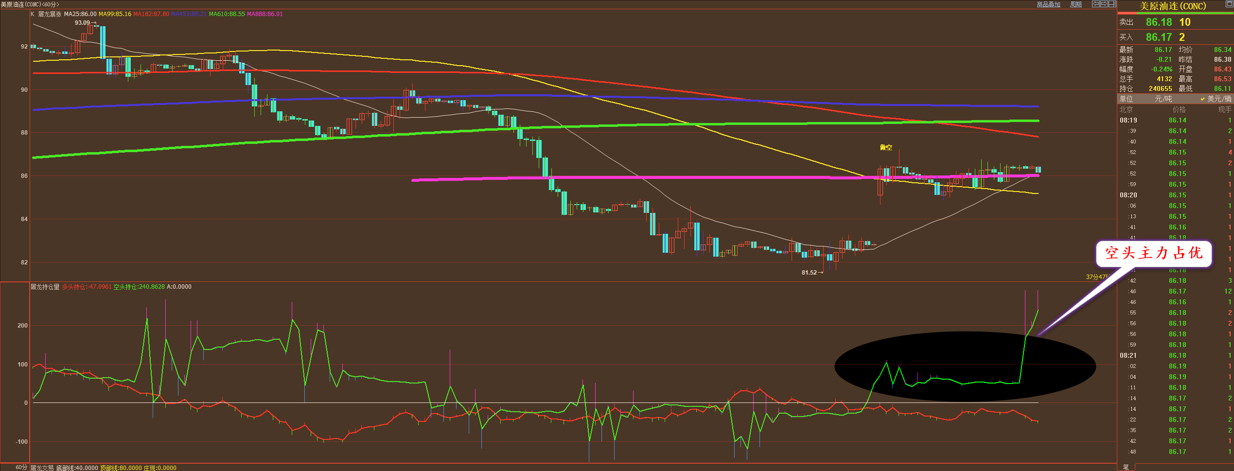 通过对原油小时图解析得知,昨日行情在高位窄幅震荡运行,到达上方87.30一线盘中冲高回落,我们从下方的幅图可以清楚地看到在跳空高开反弹的过程中空头主力有增仓的动作并且已经处于高度控盘的状态,多头主力有继续出逃的迹象,短期冲高回落的可能性比较大一点,但是不排除数据事件影响继续反弹短期上方我们继续重点关注