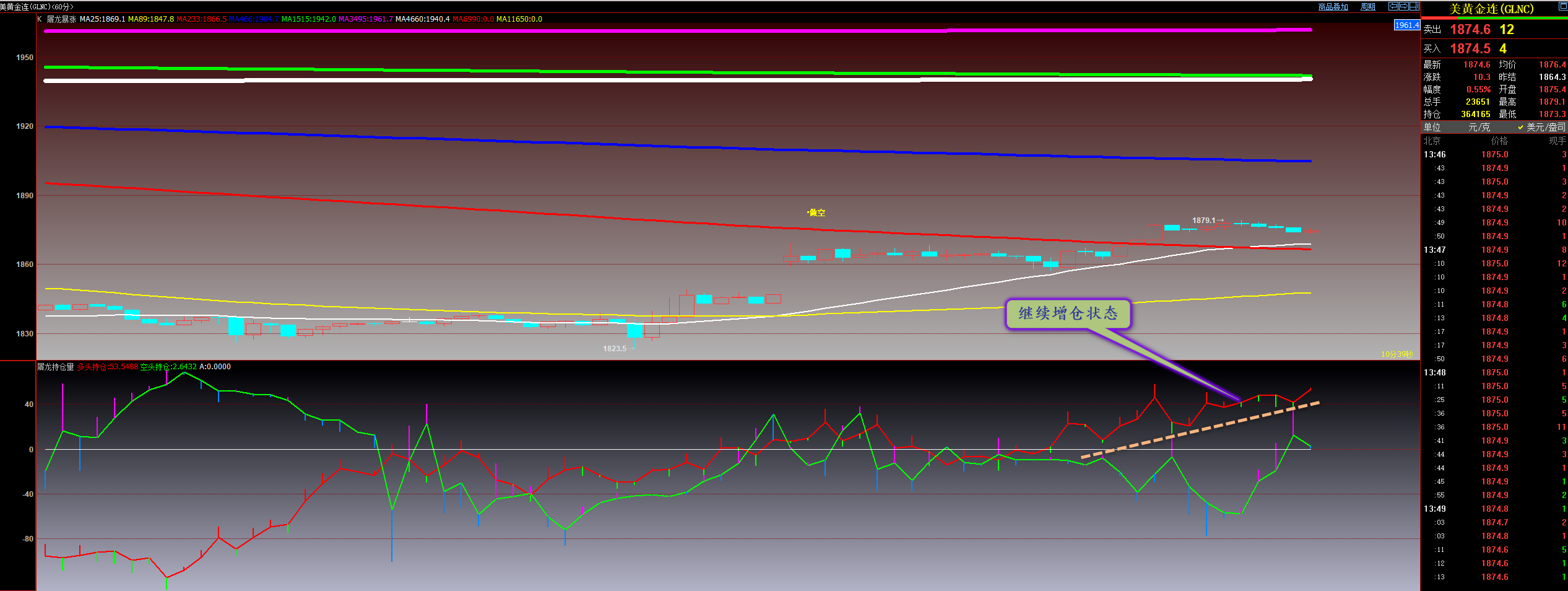 通过对黄金小时图解析得知,黄金从早盘到目前为止继续在高位窄幅震荡调整运行,我们从下方的附图可以清楚的看到多头主力继续处于增仓的状态,虽然在压力位空头主力有一部分资金进仓,但是回调的空间比较小,不出意外的话行情应该是还要继续实现突破,短期上方我们重点关注1880一线的压制即可,操作上我们暂且继续高空低