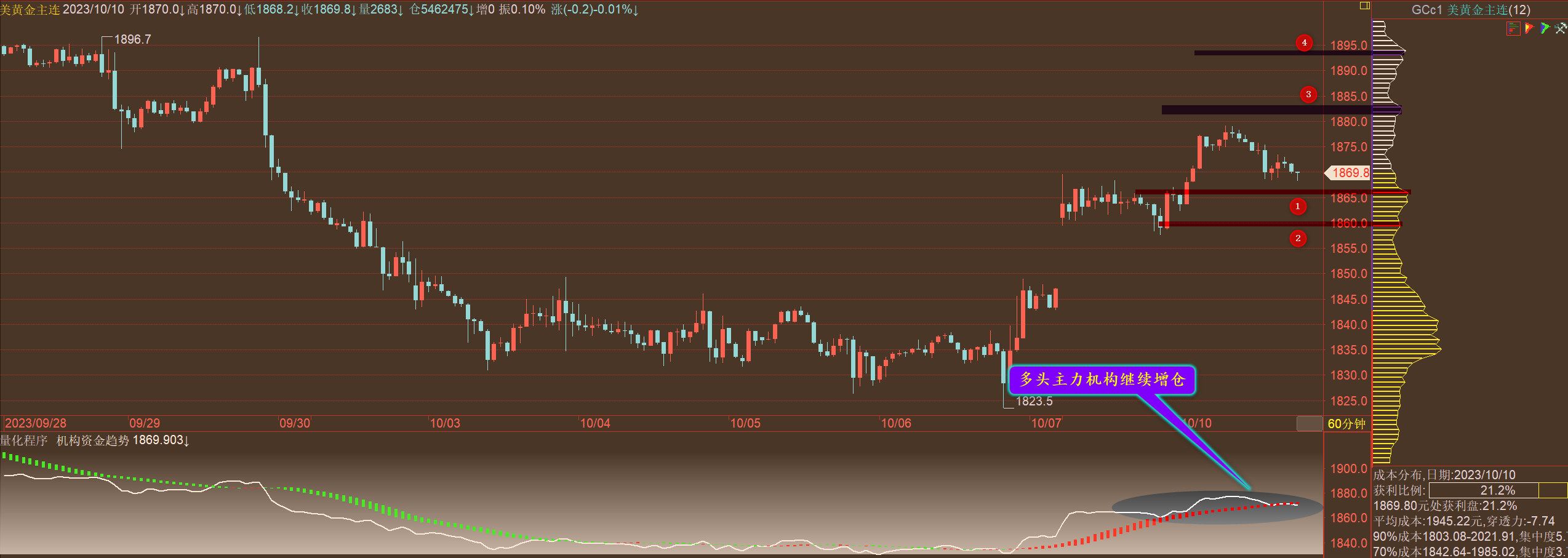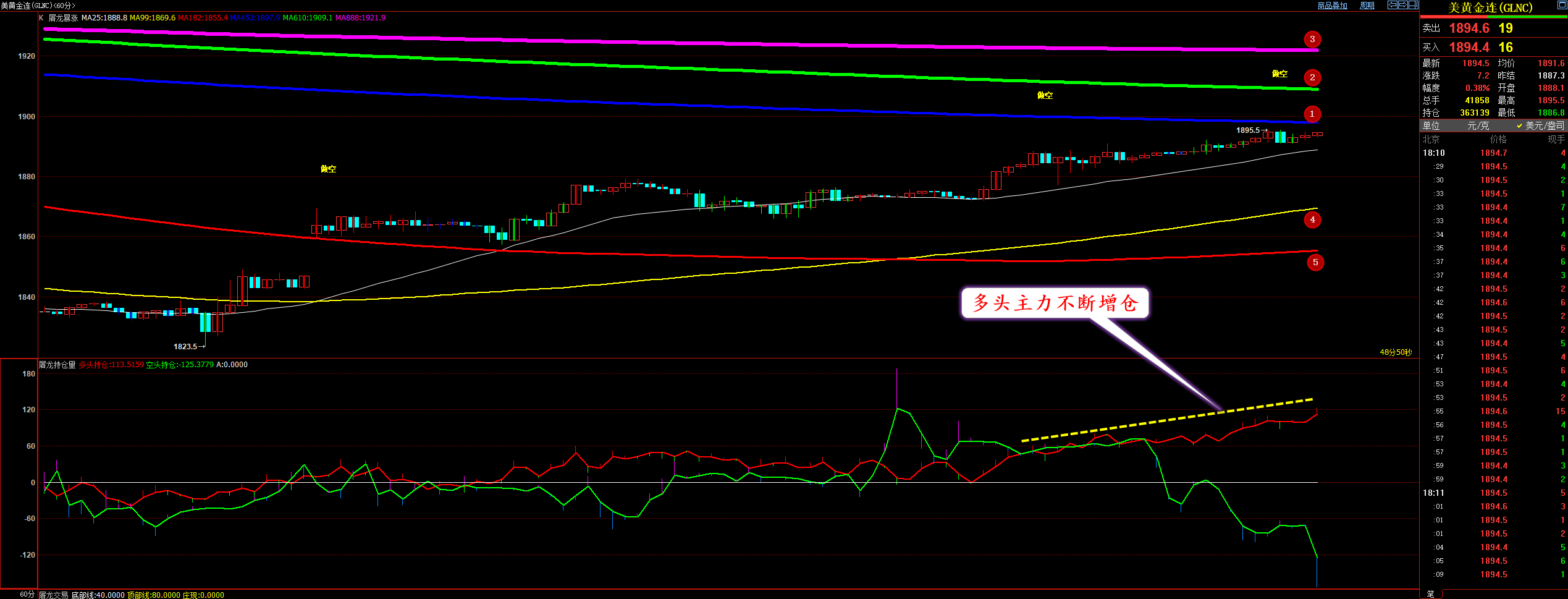 通过对黄金小时图解析得知,黄金从早盘继续一路震荡上行突破,回调空间比较小,,之所以力道强最主要的是,我们从下方的幅图就可以清楚地看到,多头主力在横盘震荡调整的期间不断的增仓介入,所引发行情不断的攀升,短期上方即将到达1号均线压力位,不排除进一步突破到达上方23号均线压力位,短期下方我们重点关注45号均