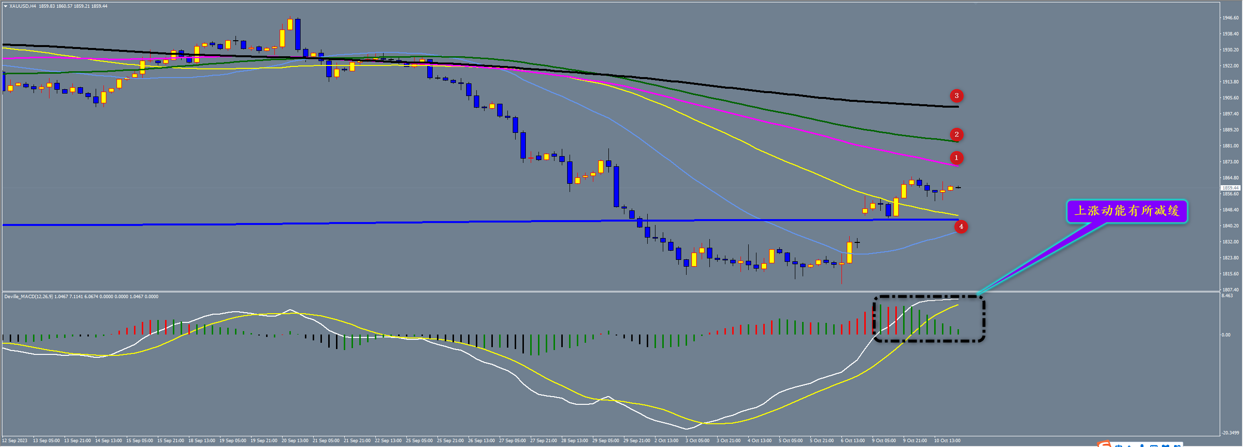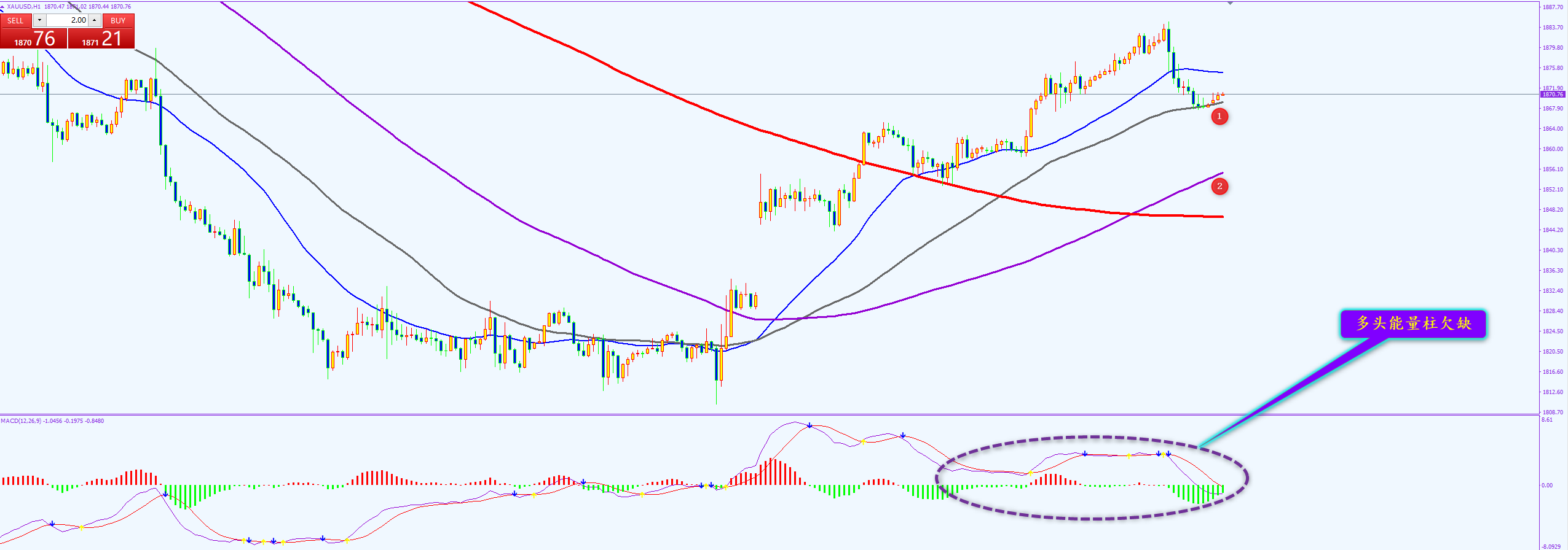 通过对黄金4小时图解析得知,自从上周五行情止跌反弹以来行情一路反弹,我们从下方的幅图也可以清楚地看到多头动能有所减缓力道有些不足,但是目前已经介入强势区运行,虽然上方受均线系统的压制短期还没有完全脱离苦海下方支撑的有效性还需要回调确认一下,短期下方我们继续重点4号均线(1843)和下方1830的支撑,短期