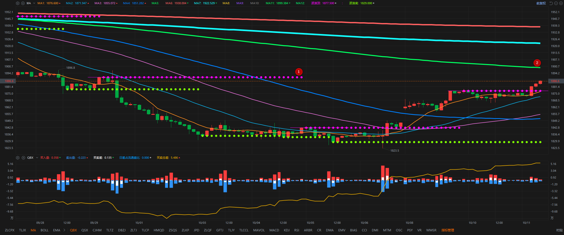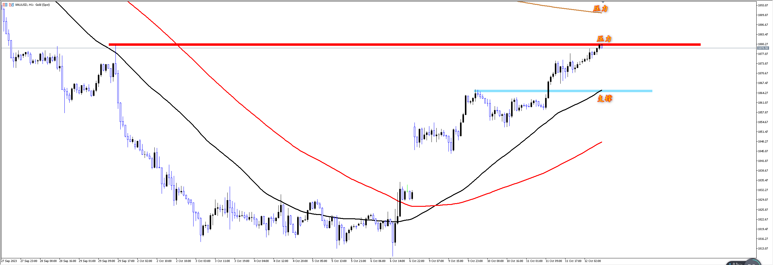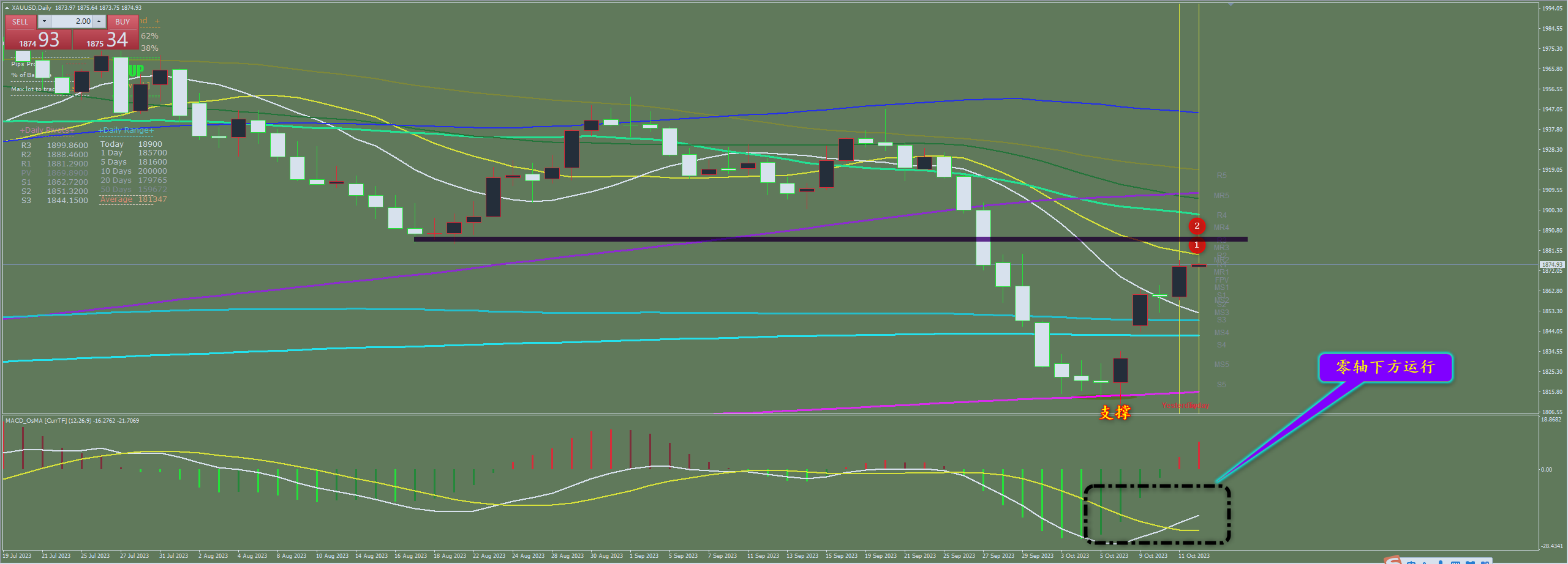 通过对黄金日线图解析得知,昨日行情先跌后涨,继续延续反弹走势,自从在下方均线支撑位得到超级主力的关照行情一路拉升,目前即将到达1号均线的压力以及前期底部的压力相对而言将会出现一波回调动作,短期下方我们继续重点关注1861和1850一线的支撑,短期受巴以愈演愈烈影响不排除进一步的拉升突破到达1900一线,在操作