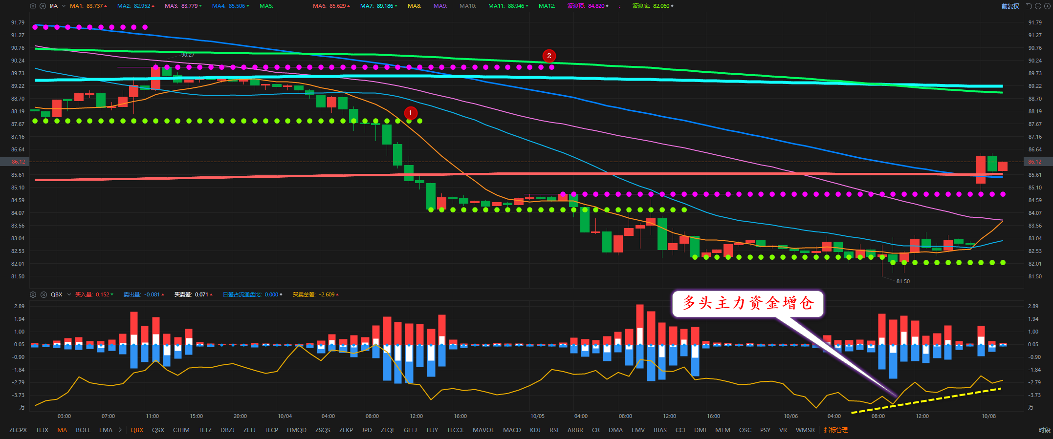 通过对黄金小时图解析得知,昨日行情如期先跌后涨晚间如期放量突破到达前期的底部位置压制,之所以会放量突破我们从下方的幅图可以清楚地看到多头主力一直是处于增仓的状态并且已经开始走强大于空头主力的力道,相对而言到达压力位有一定的压制作用,但是短期反弹的动能不减有进一步反弹的可能性,短期在操作上我们继续