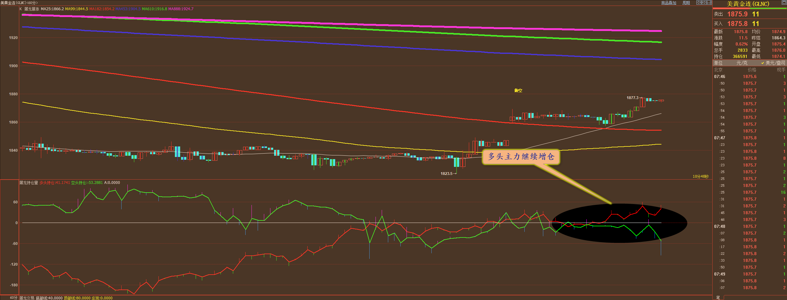 通过对黄金小时图解析得知,黄金从早盘跳空高开以来一直在高位震荡调整多空双方争夺比较厉害,我们从下方的附图也可以清楚的看到多空主力都有增仓动作分不清彼此,说明行情要在高位来回震荡调整,短期我们重点关注上方均线的压力位即可,在操作上我们高空低多思路,具体建议参考早盘策略