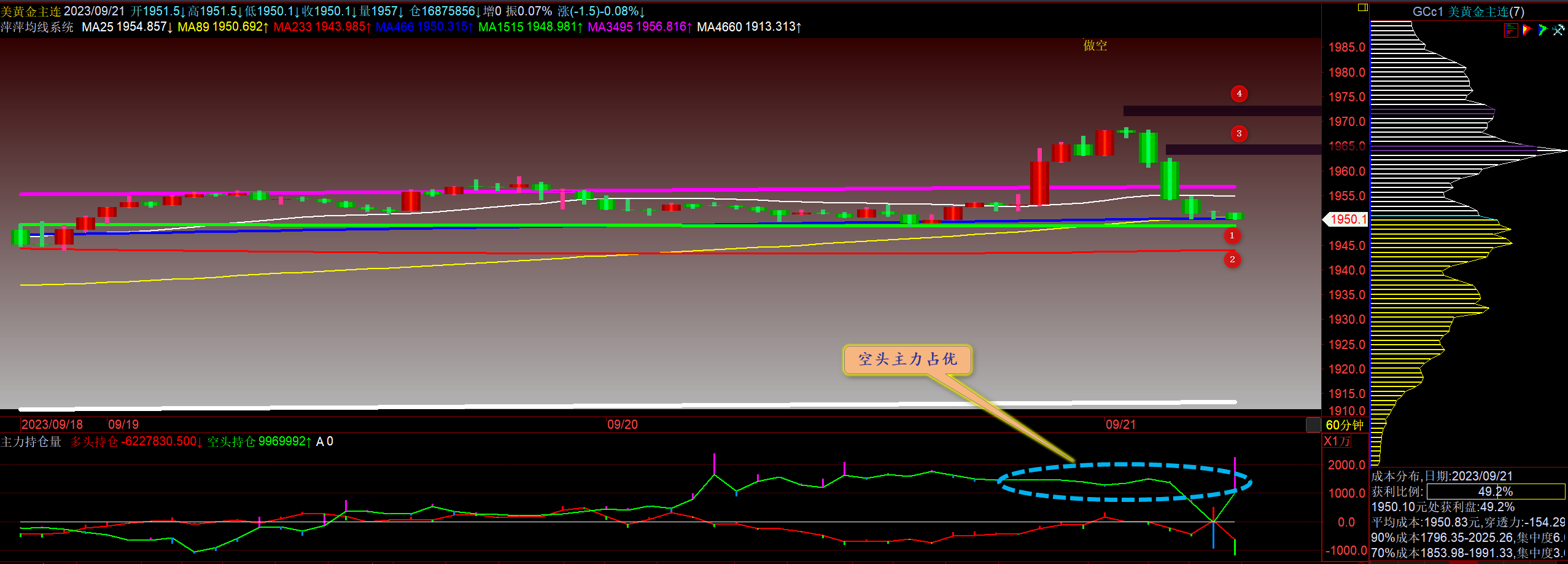 通过对黄金小时图解析得知,黄金早盘如期下探到下方均线支撑位目前小幅反弹一点上方1930一线已经成为短期的一个小压力,就看能不能进一步的突破上行,我们从下方的附图可以可以清楚的看到空头主力大量的出逃,多头主力有小幅增仓动作说明多头主力在底部区域震荡筑底行为,非常有可能突破上方1930一线的阻力位,短期在操