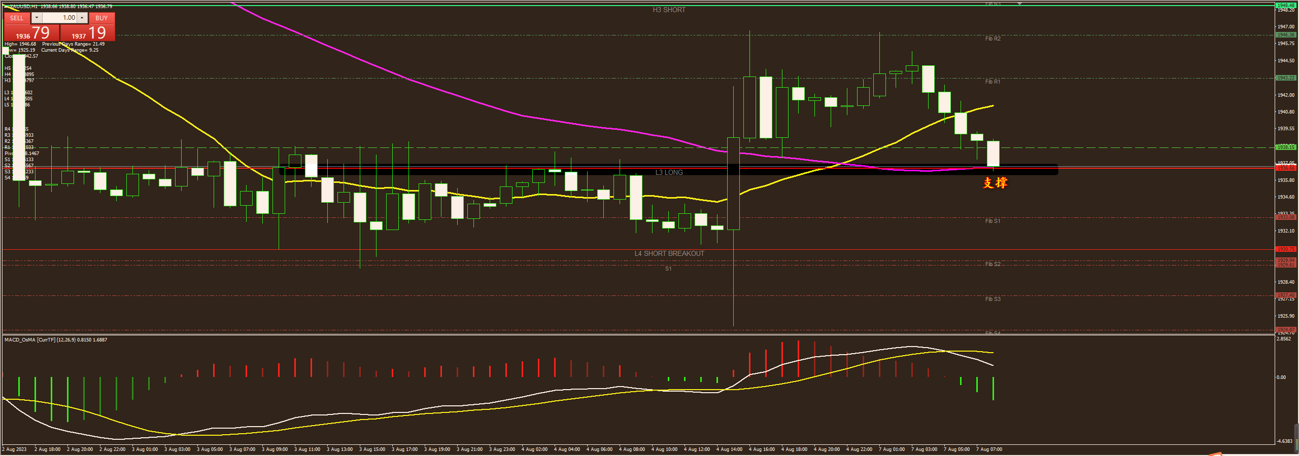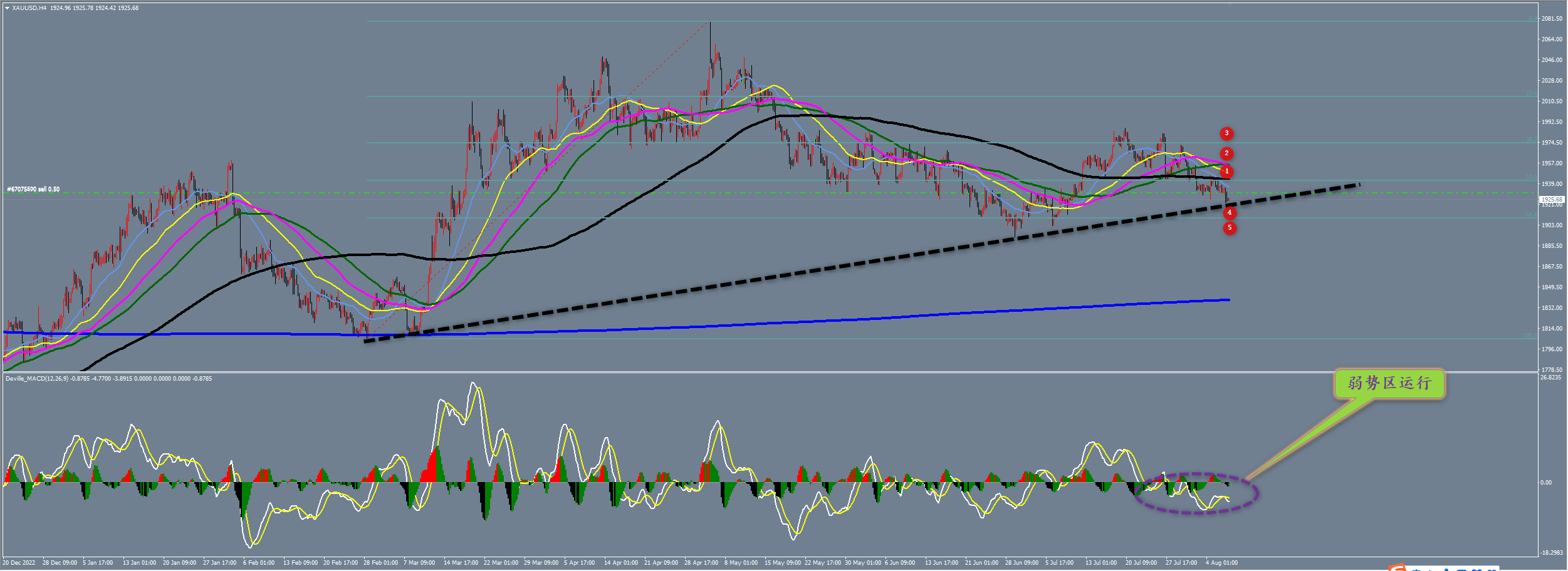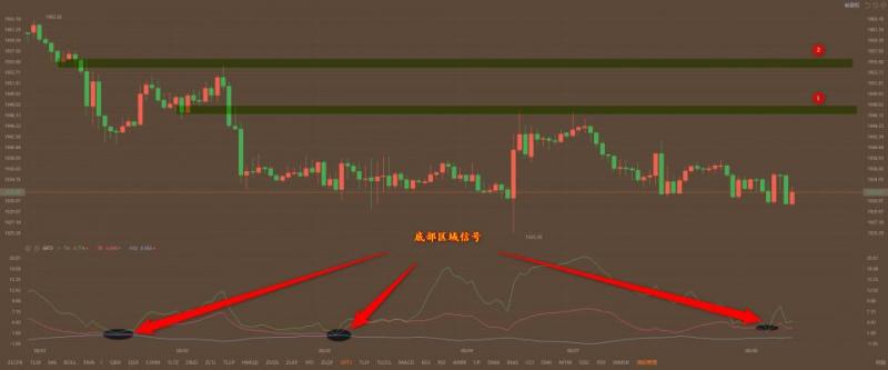 通过对黄金小时图解析得知,黄金从早盘到目前为止一直是在处于弱势盘整状态,在下方1931一线得到支撑有所反弹,我们从下方的幅图来看,目前已经再次出现底部信号,在上周出现底部信号相对而言都出现了一波小幅反弹动作,目前再次出现预计上方的12号目标位,短期在操作上我们继续高空低多思路,具体建议参考早盘策略即可
