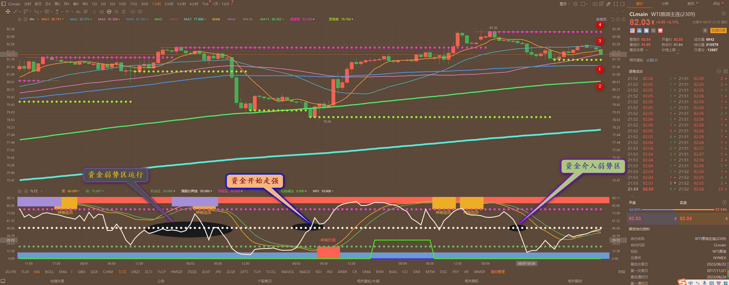 通过对原油4小时图解析得知,昨日行情先跌后涨如期形成在高位宽幅震荡走势,纵观全局我们从下方的幅图可以清楚地看到在前期反弹到83.50一线出现了资金顶背离迹象同时也是前期的底部位置相对而言也是有一定的压制作用,在下方63.60一线我们可以清楚地看到连续2次都得到了超级主力抄底的动作特别是横盘震荡期间多头主力资