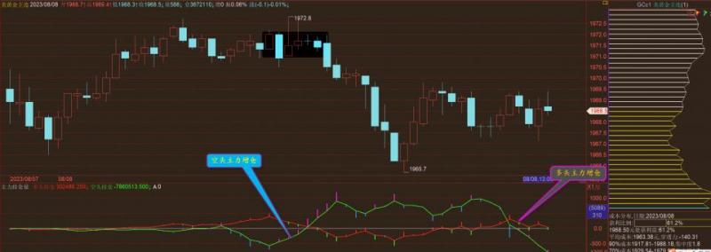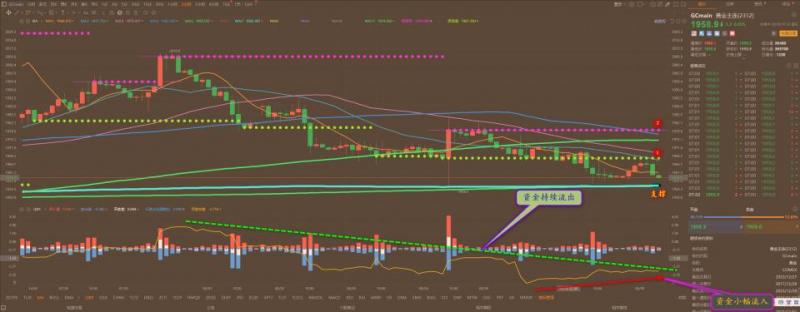 通过对黄金小时图解析得知,昨日行情冲高回落到达下方1932一线止跌反弹,我们通过下方的幅图可以清楚地看到在每次的阶段性底部区域都出现了多头主力建仓信号建仓的位置既是支撑也是压力这也是为什么昨日冲高回落的原因,上周五晚间有拉高出货动作,昨日晚间我们再次发现有部分主力资金进仓信号,上方1944和1951以及1959